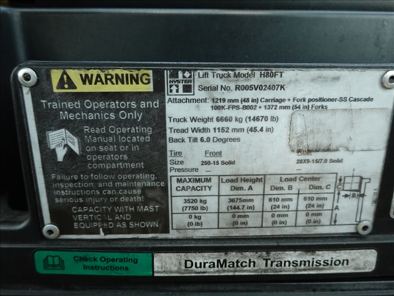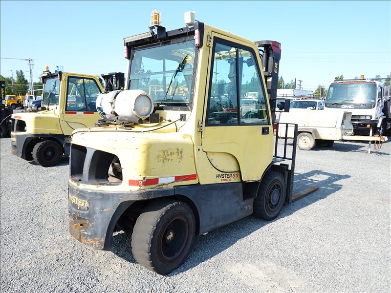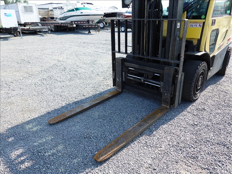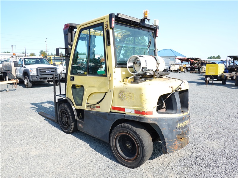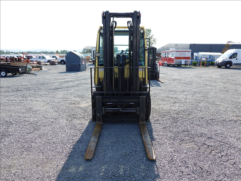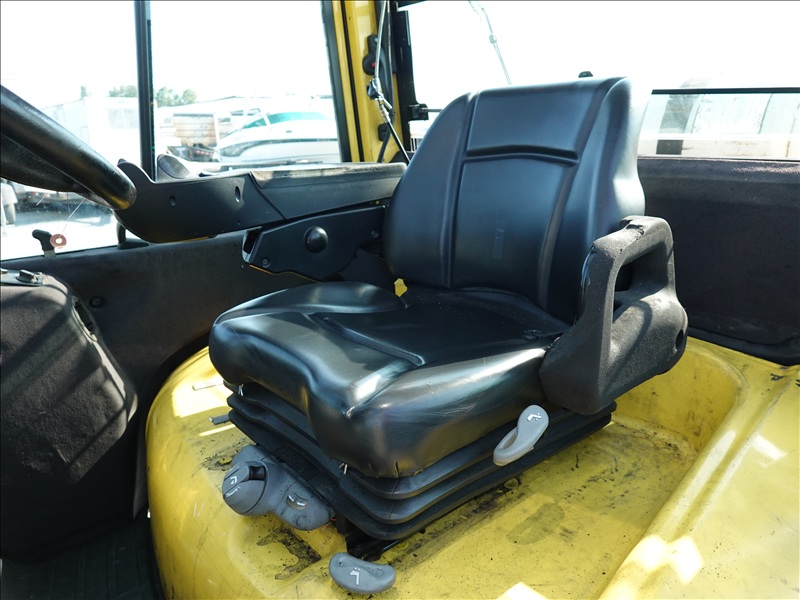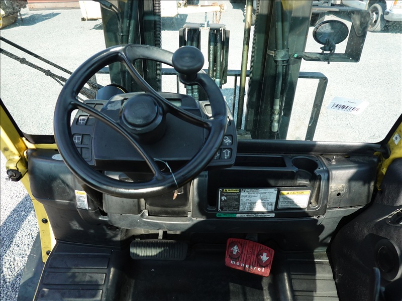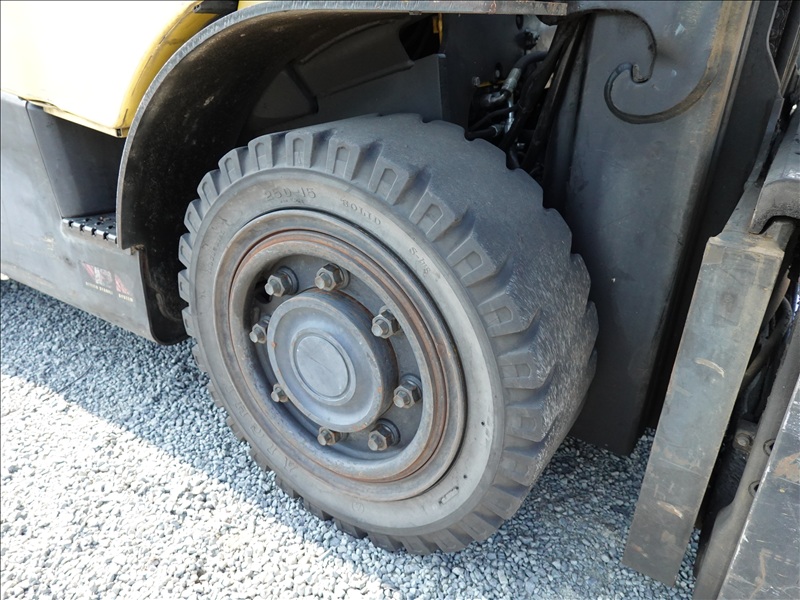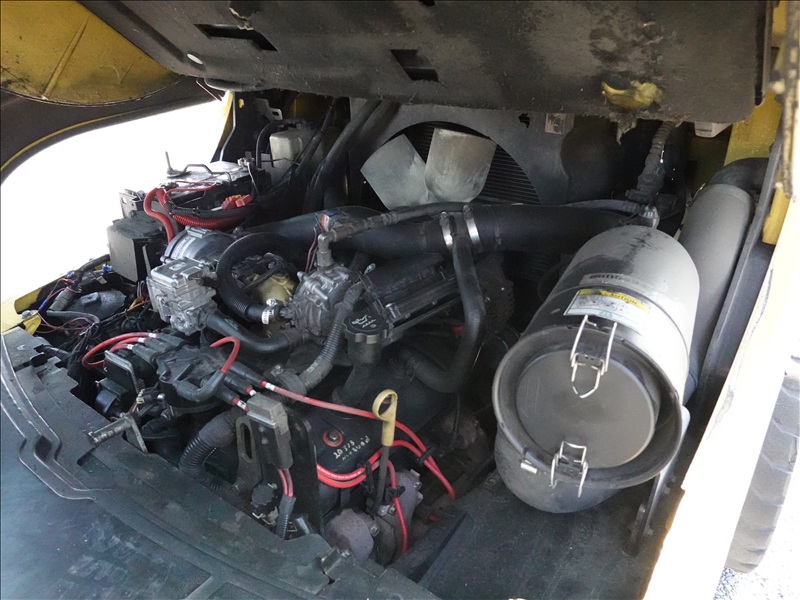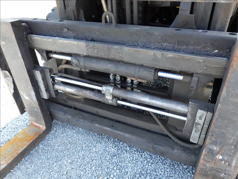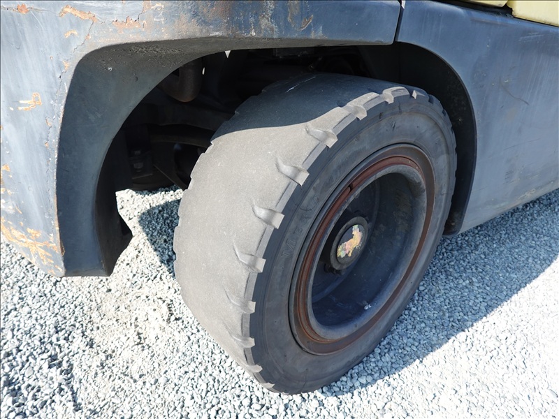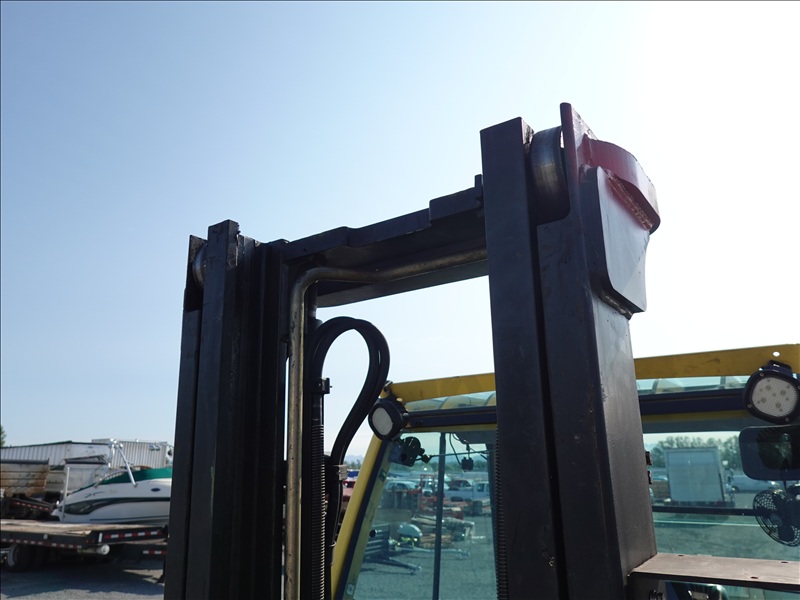 7,750 LB SOLID TIRE FORKLIFT, 144.7" FORK HEIGHT, 2-STAGE MAST, SIDE SHIFT, FORK POSITIONER, FTC, 6 CYL LPG, CAB (EXHAUST LEAK, MISSING EXHAUST COMPONENTS, UNABLE TO READ HOUR METER, SEE PHOTO)