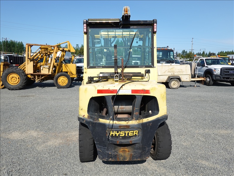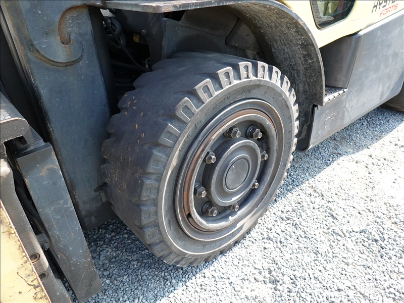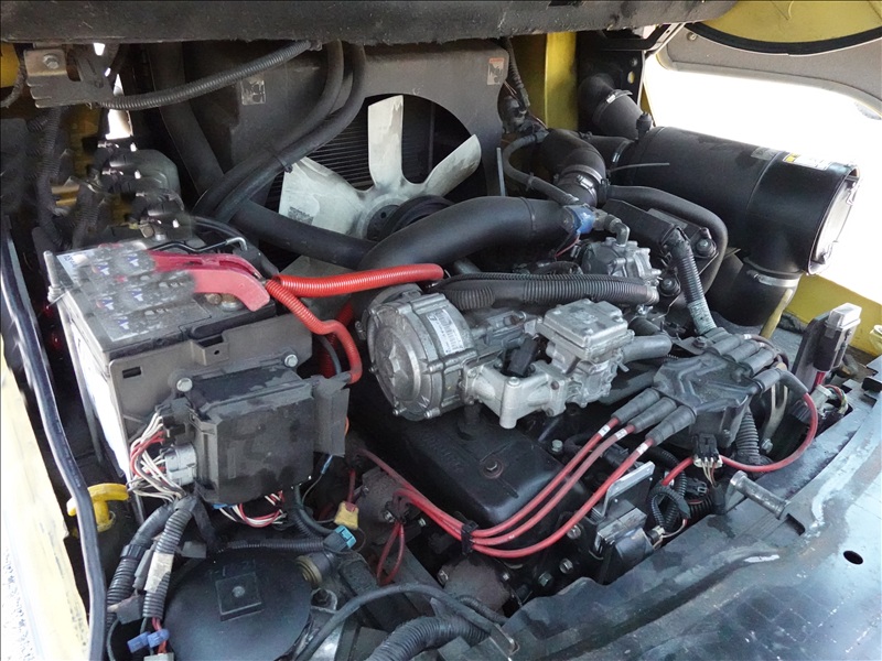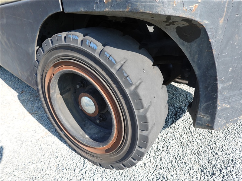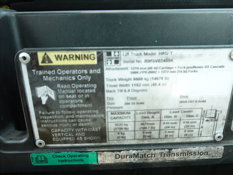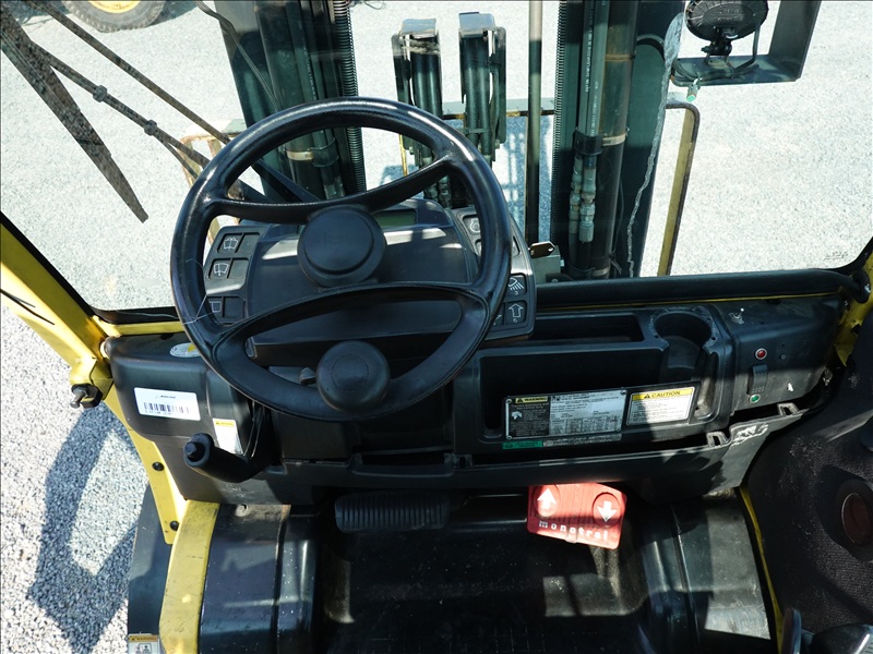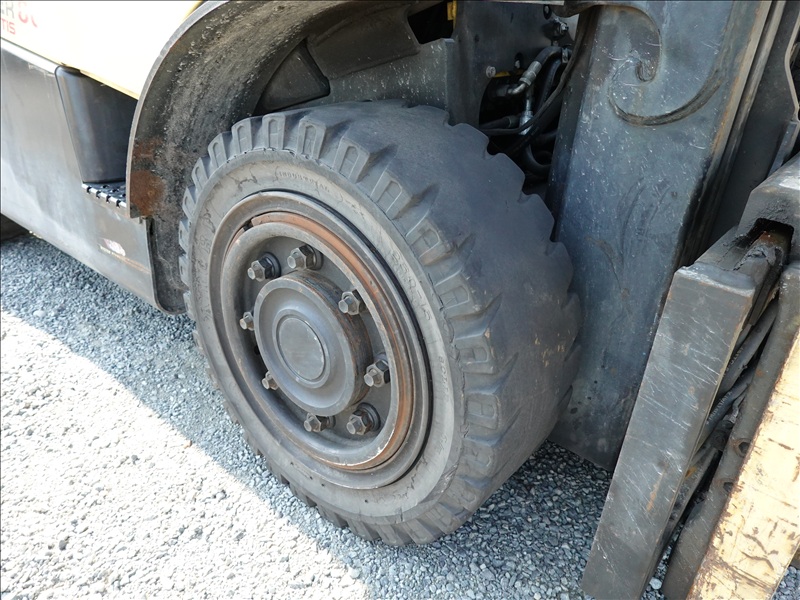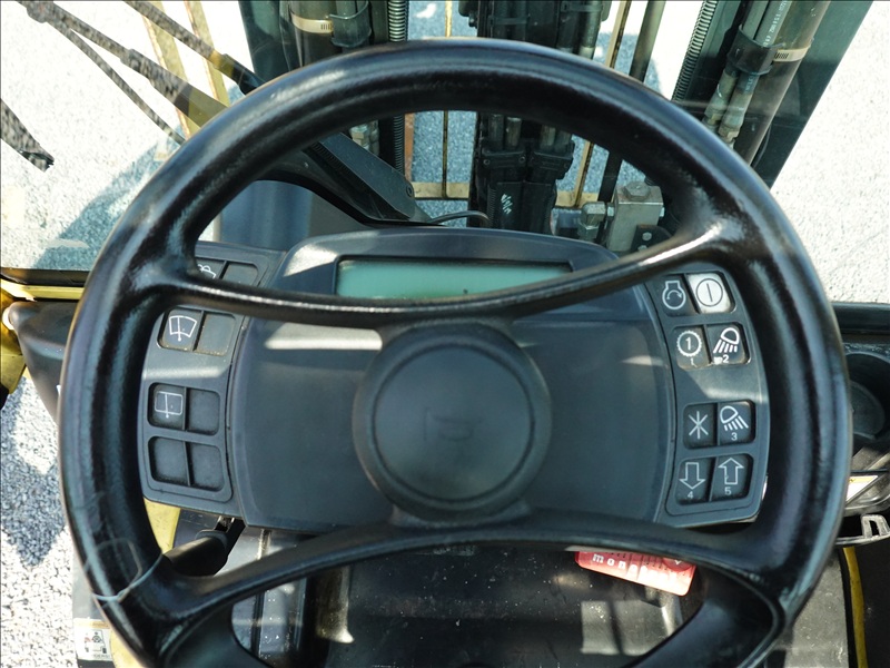 7,750 LB SOLID TIRE FORKLIFT, 144.7" FORK HEIGHT, 2-STAGE MAST, SIDE SHIFT, FORK POSITIONER, FTC, 6 CYL LPG, CAB (NO PROPANE TANK, FAULT CODE 522606-10)