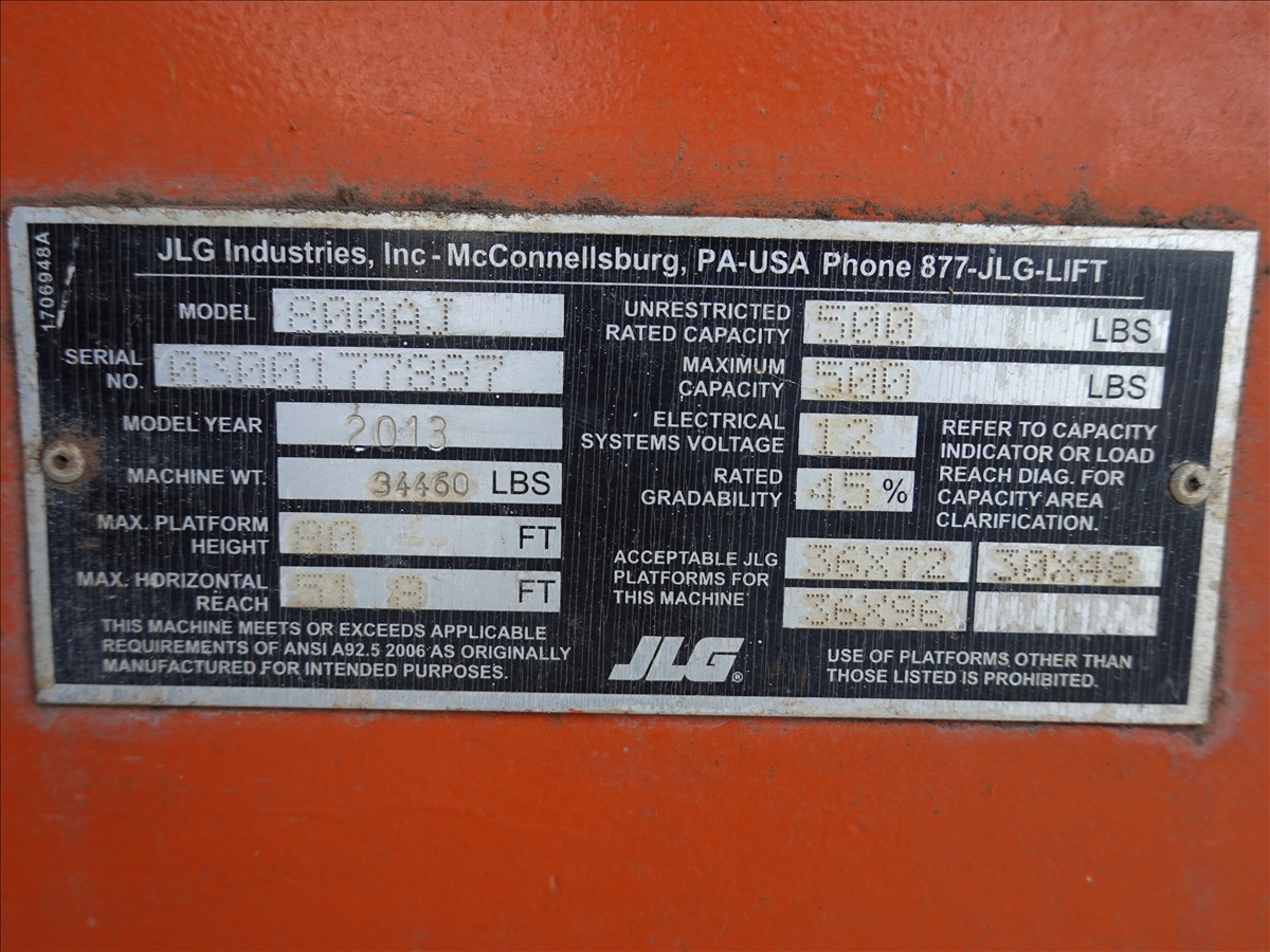 TELESCOPIC BOOM LIFT, 80' PLATFORM HEIGHT, 51'8" HORIZONTAL REACH, 500 LB CAPACITY, A/C RECEPTICAL AT PLATFORM
