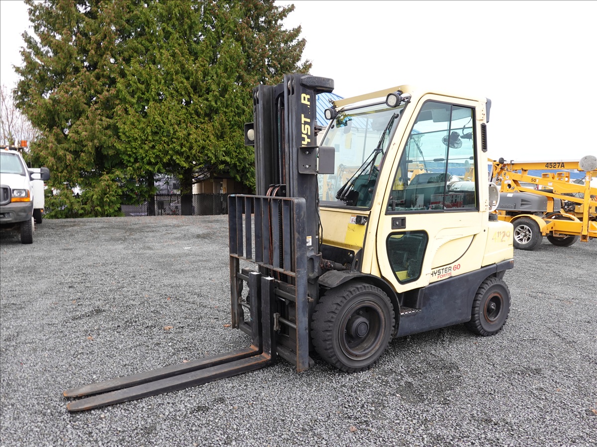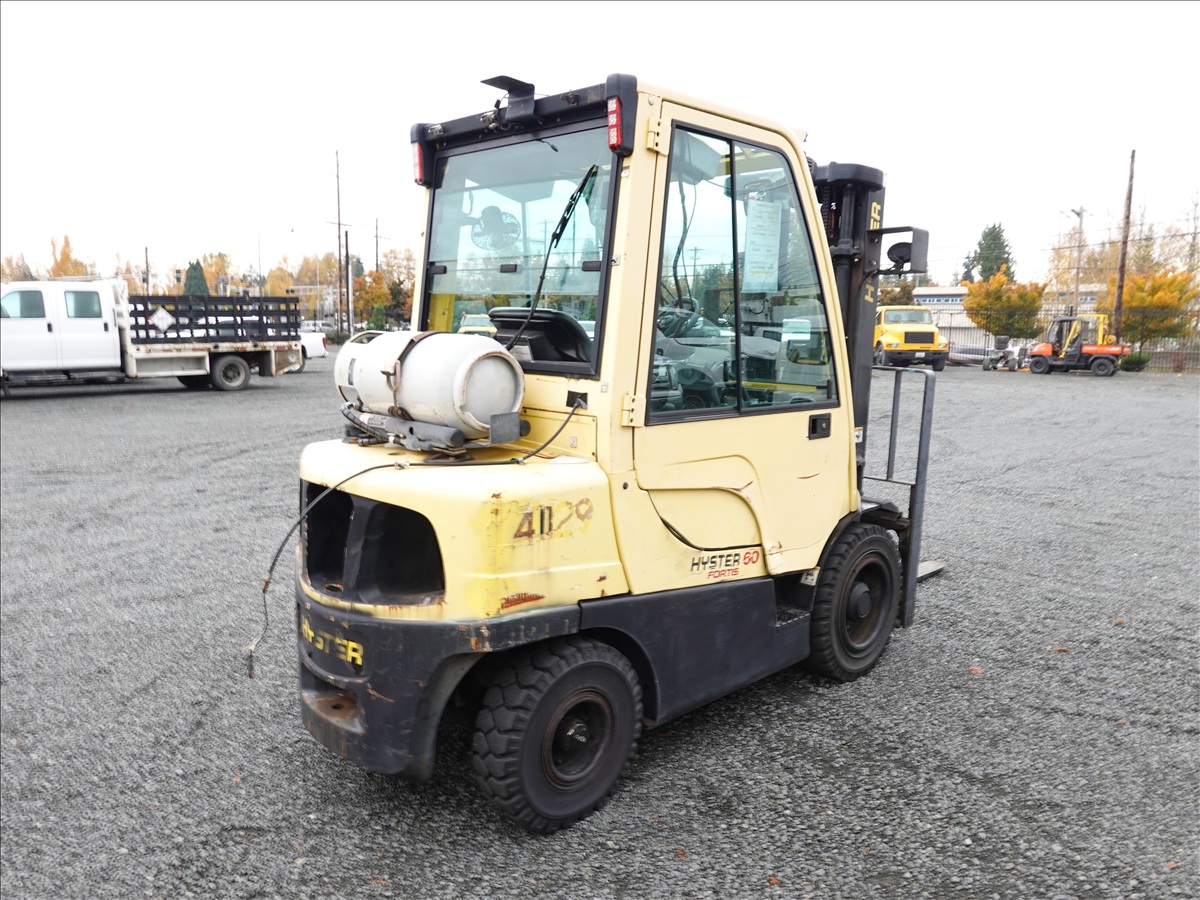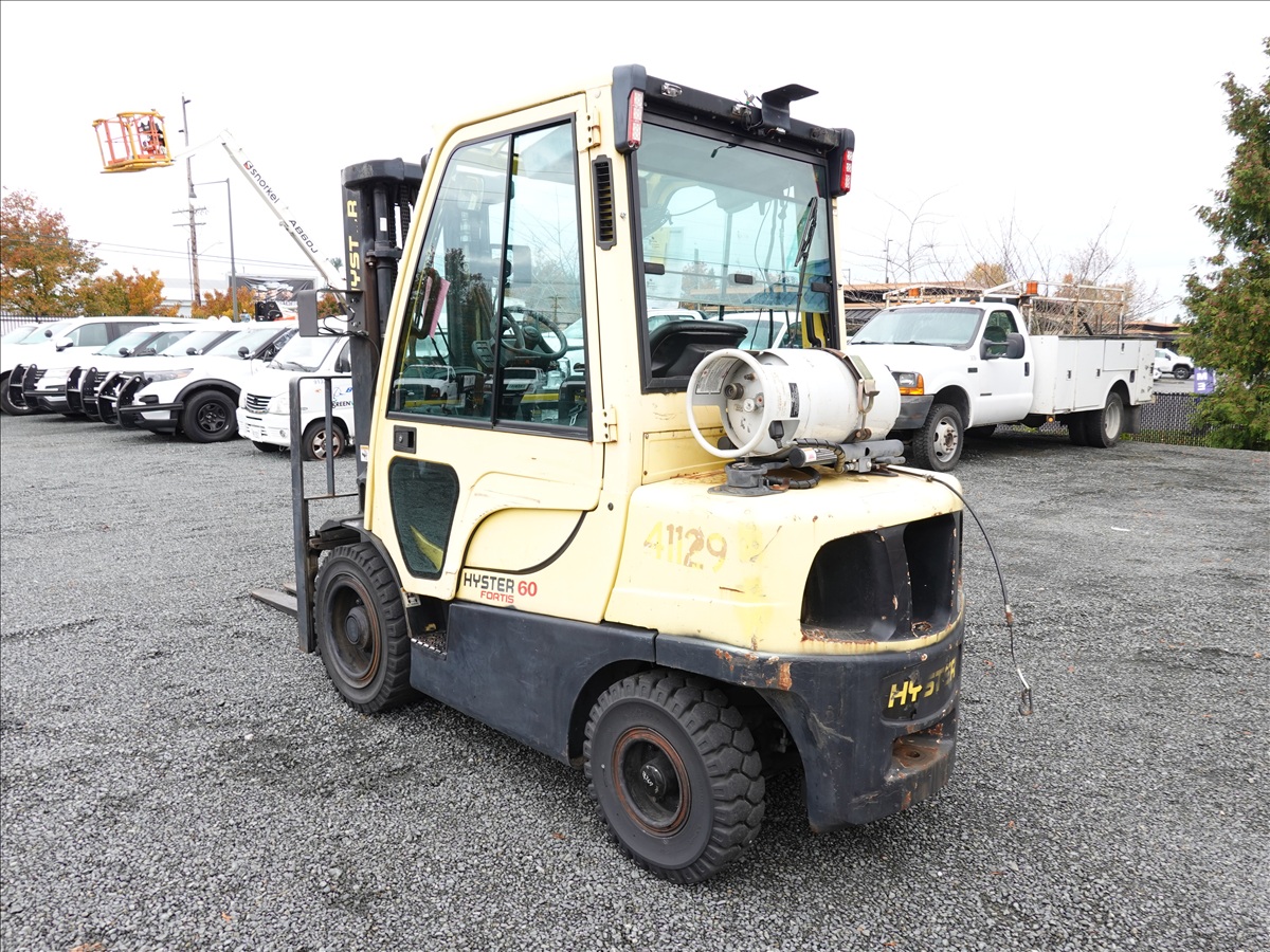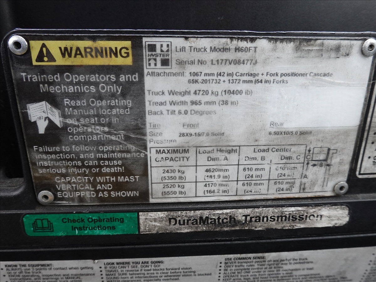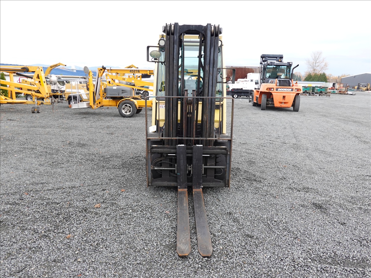5,350 LB SOLID TIRE FORKLIFT, 181.9" FORK HEIGHT, 3-STAGE MAST, SIDE SHIFT, FORK POSITIONERS, 54" FORKS, FTC, 4 CYL LPOG, CAB