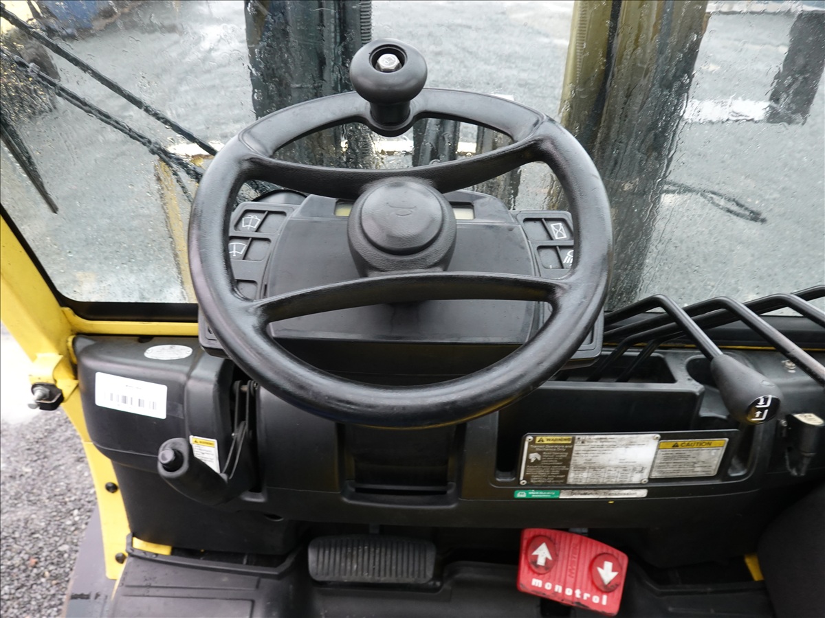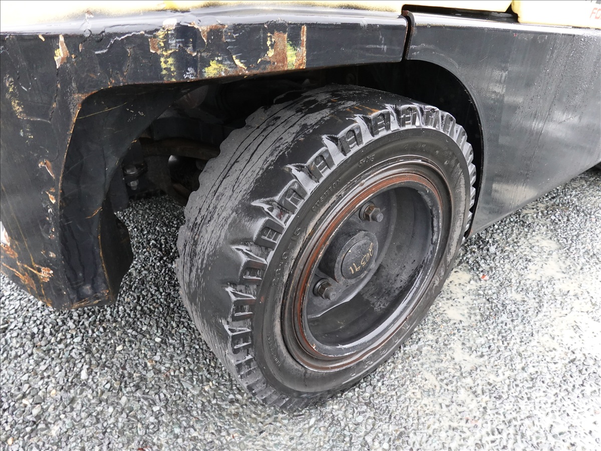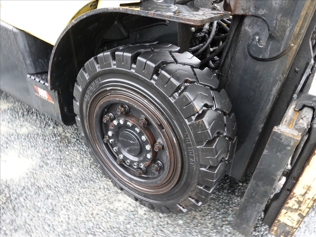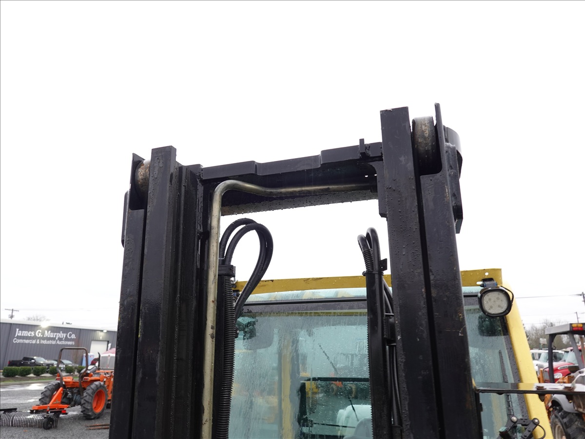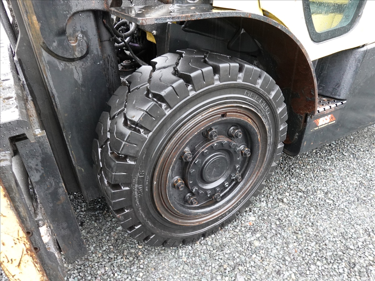 7,150 LB SOLID TIRE FORKLIFT, 185.6" FORK HEIGHT, 2 STAGE MAST, SIDE SHIFT, FORK POSITIONERS, 54" FORKS, 6 CYL LPG, CAB