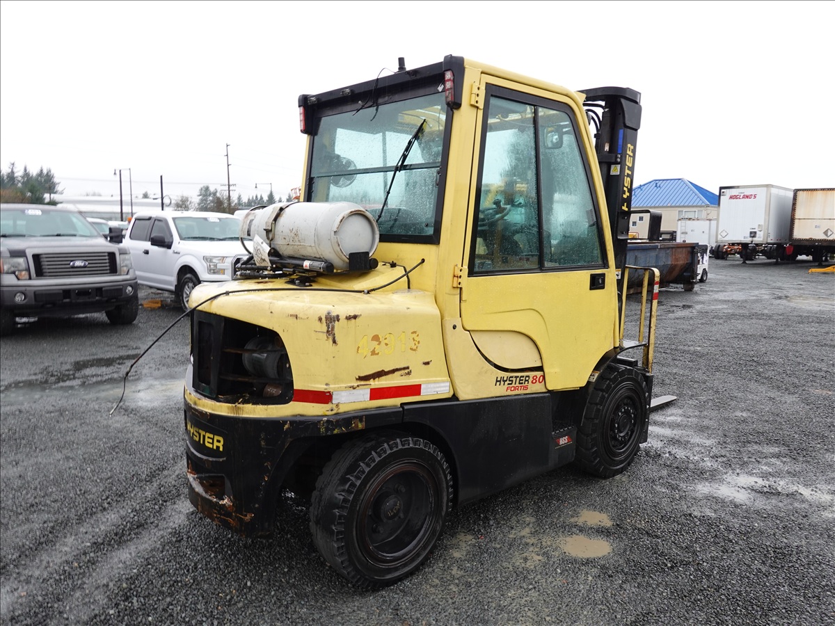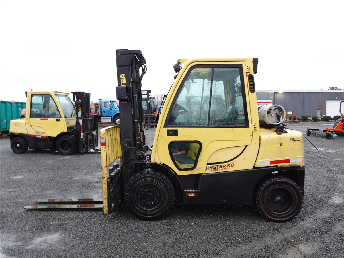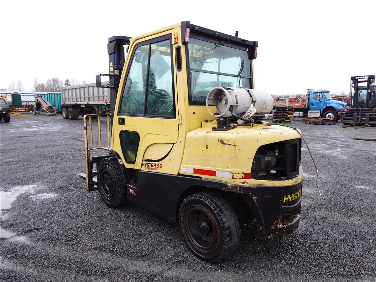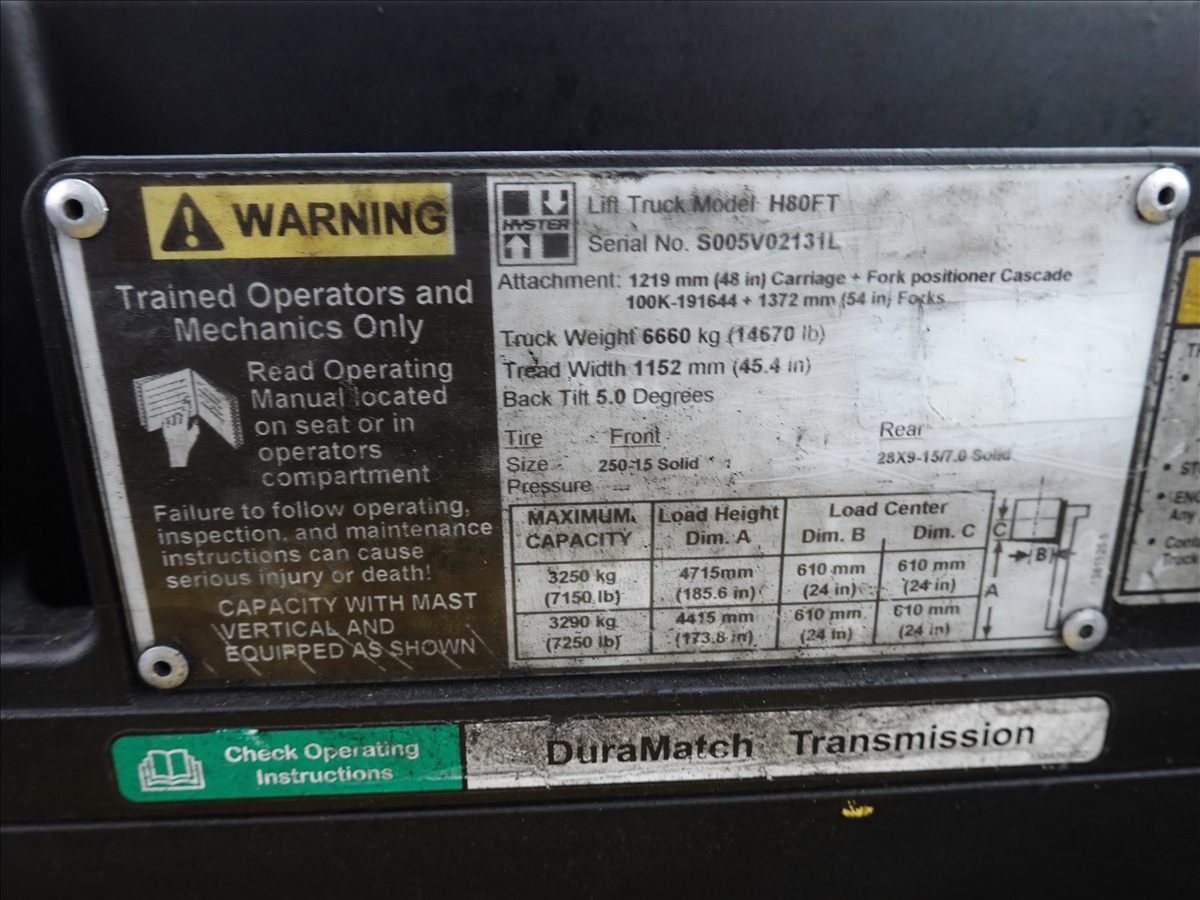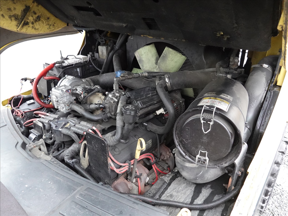 7,150 LB SOLID TIRE FORKLIFT, 185.6" FORK HEIGHT, 2 STAGE MAST, SIDE SHIFT, FORK POSITIONERS, 54" FORKS, 6 CYL LPG, CAB
