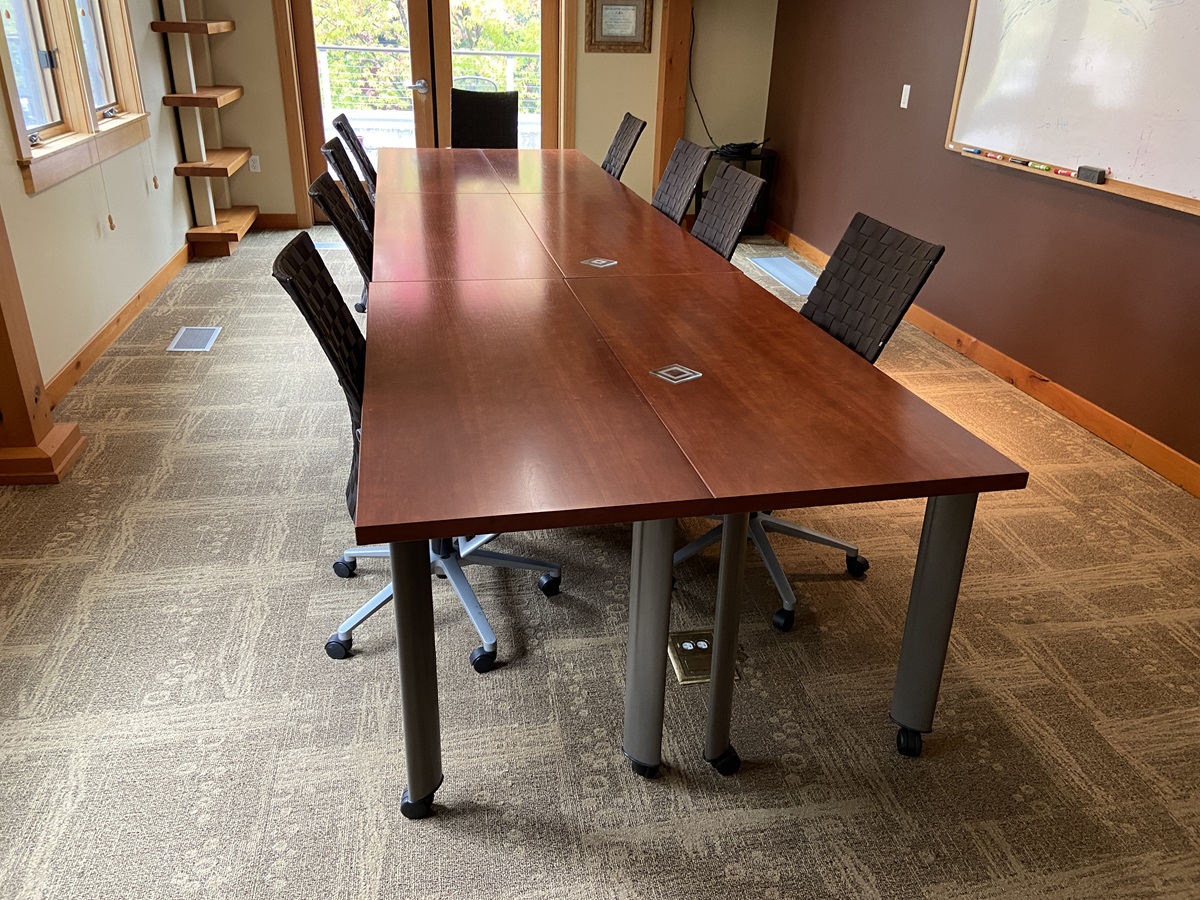 VARIABLE ARRANGEMENT MOBILE CONFERENCE TABLE SETUP CONSISTING OF: (6) 2'X5' WOOD TOP TABLES ON CASTORS & (14) WOVEN FABRIC HIGH BACK ARM CHAIRS ON CASTORS