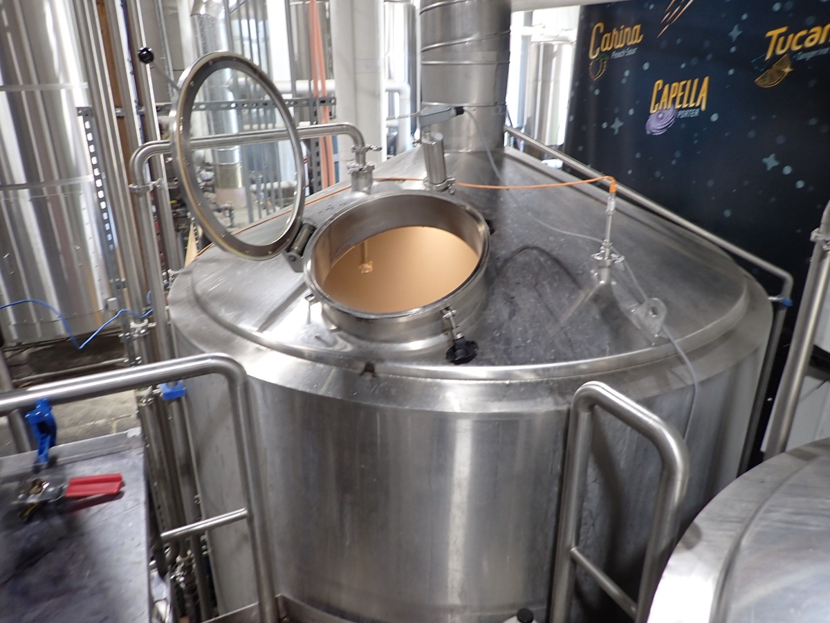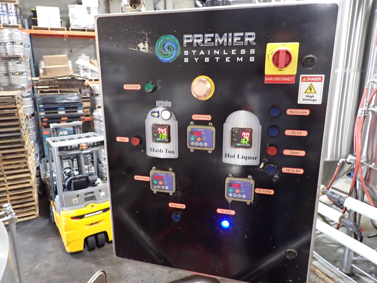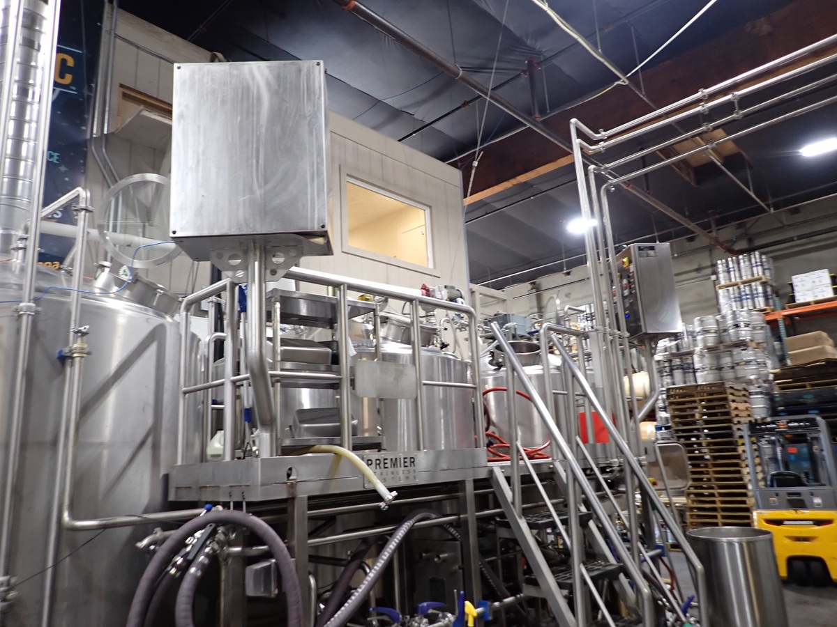 30 BARREL, 3-VESSEL BREWHOUSE, STEAM JACKETED KETTLE, WHIRLPOOL, MASH LAUTER TUN W/AGITATOR, HEAT EXCHANGER, (2) TRANSFER PUMPS, (2) CONTROL PANELS, CATWALK & PIPING