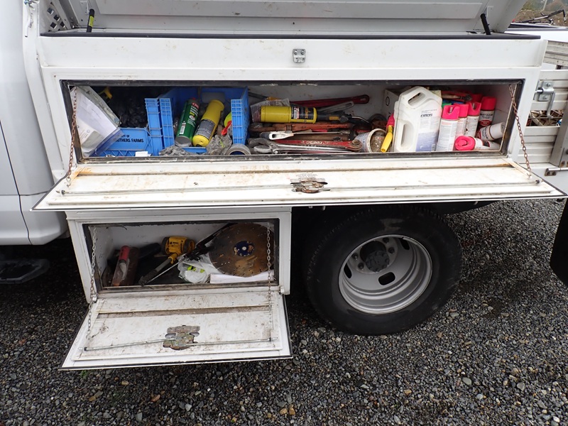 EXTENDED CAB FLATBED UTILITY TRUCK, V8, GAS, AUTO, SCELZI 10' ALUMINUM BED, AUX. FUEL TANK, SIDE BOXES, RACK, REAR SIDES