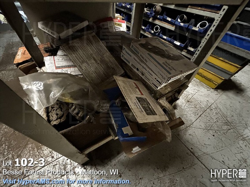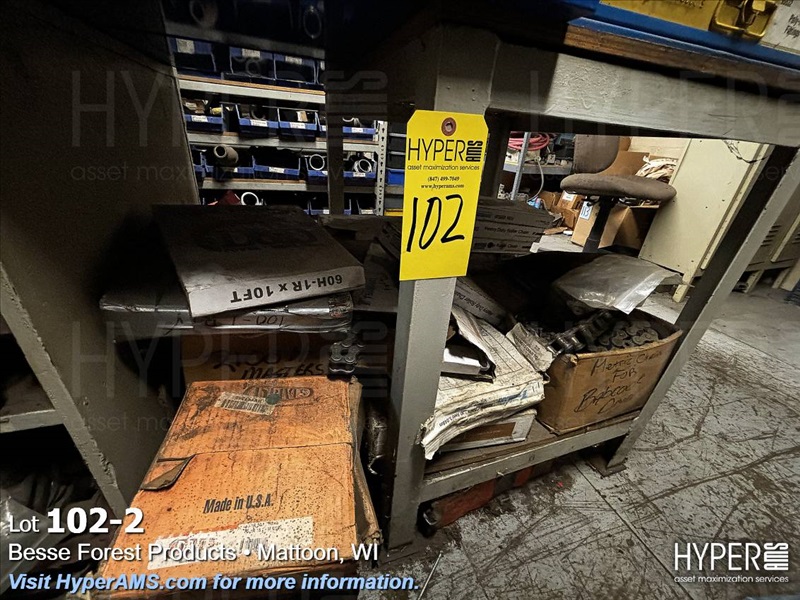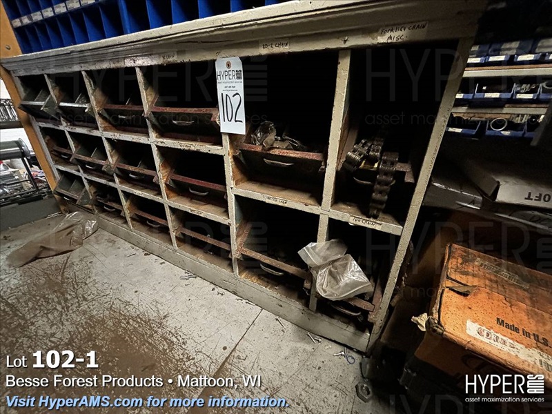 WOOD CABINETS (18 OPENS) AND STEEL TABLES WITH ASSORTED CHAIN (LOCATED ON MEZZANINE)