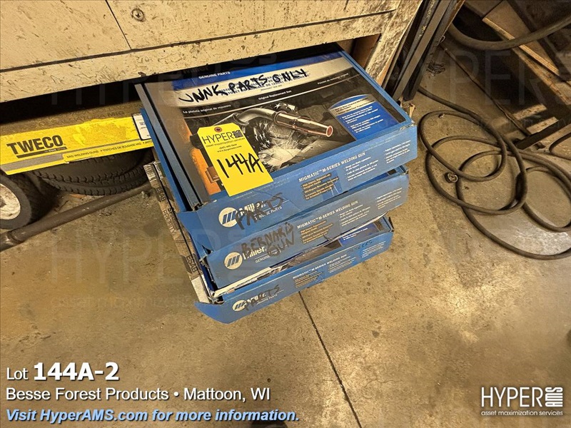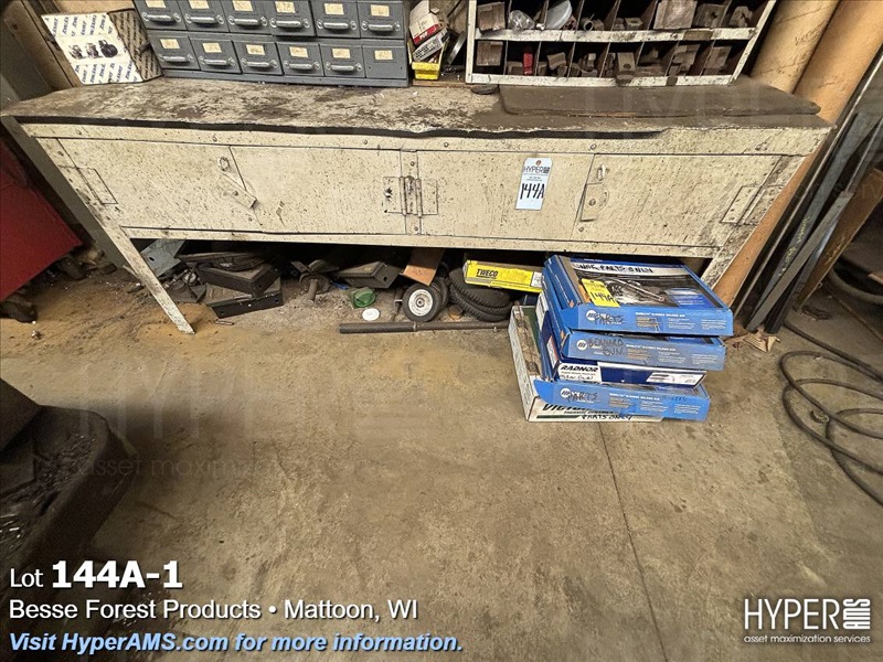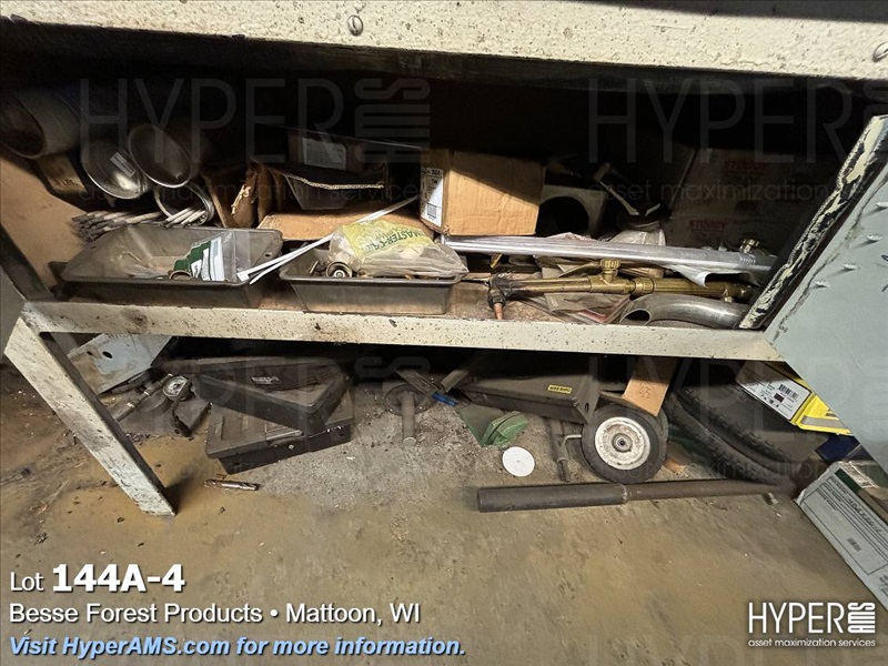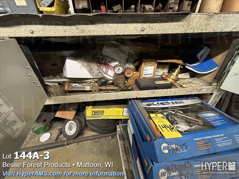 4 DOOR TABLE WITH CONTENTS IN AND UNDER-WELD GUN PARTS, TORCH PARTS, WELDING ROD, WELDING WIRE, TORCH GAUGES, ETC