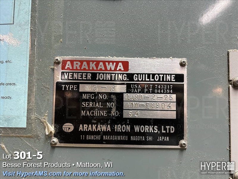 ARAKAWA VENEER JOINTING GUILLOTINE TYPE WG-8, YEAR 1990, 9' WIDE, S/N#A1W-E8904