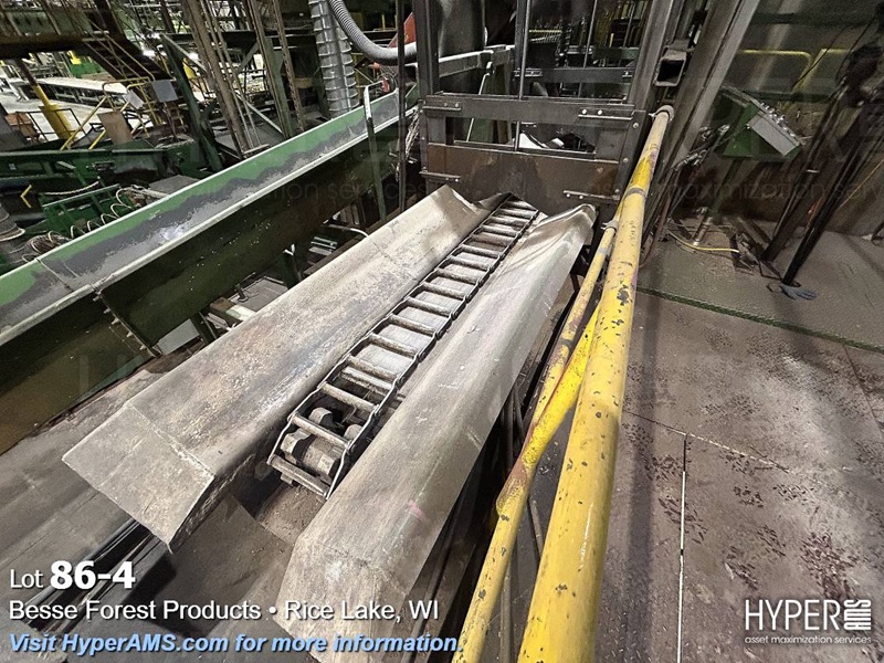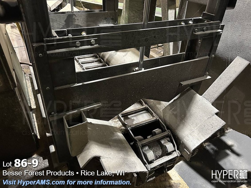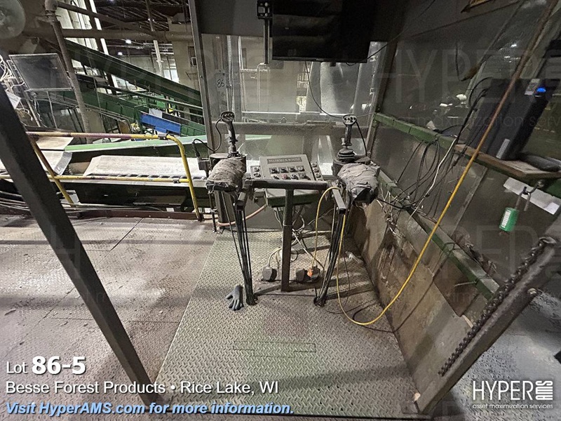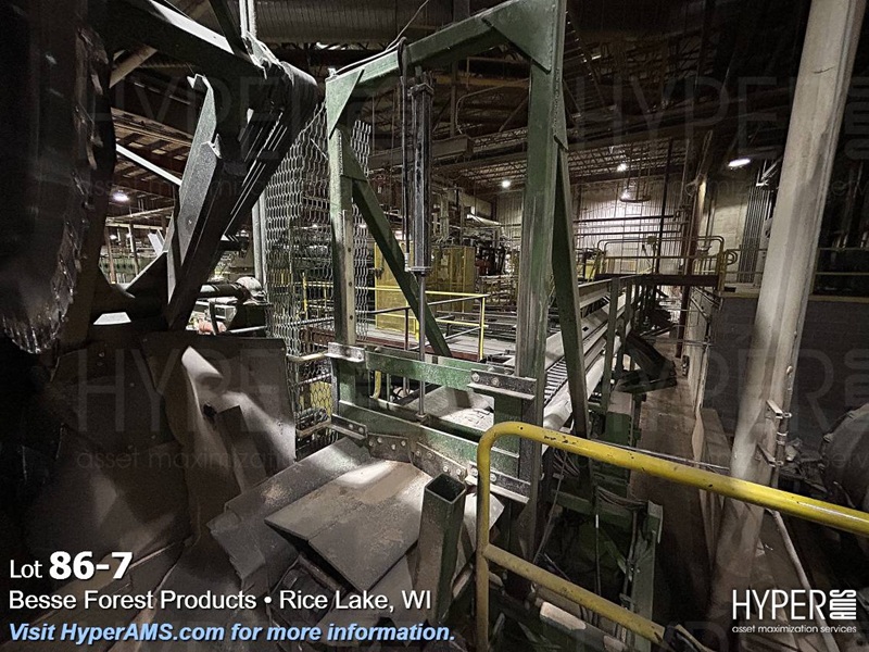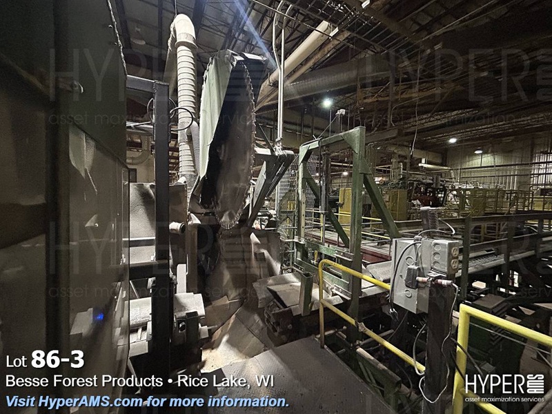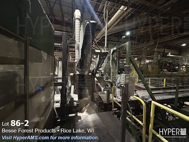 MOBARK CUT OFF SAW, 84" BLADE, CARBIDE, 75 HP, 1/2" KERF, INFEED CONVEYOR (SLIDE LEFT/RIGHT AND UP/DOWN) OUTFEED CONVEYOR (SLIDES LEFT/RIGHT) LOG HOLD DOWN CLAMPS ON INFEED/OUTFEED, WITH HYDRAULIC UNIT WITH TWIN 25HP PUMPS
