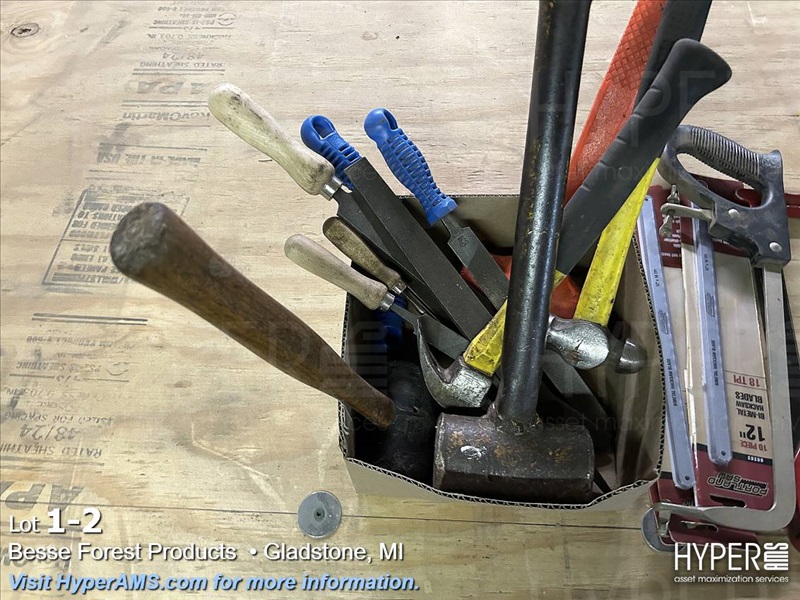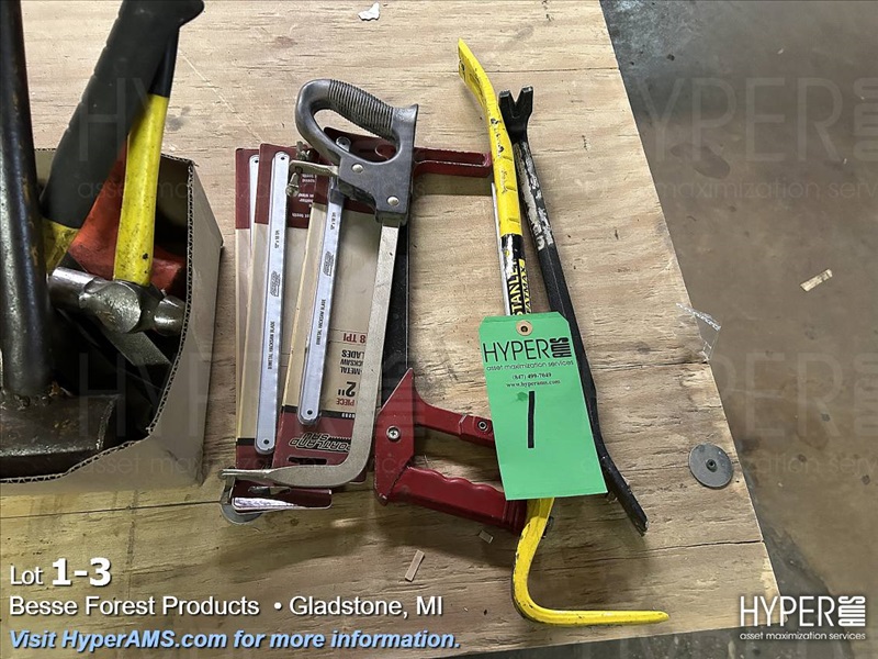 ASSORTED TOOLS-HACK SAWS AND BLADES, PRY BARS, HAMMERS, FILES, ETC.