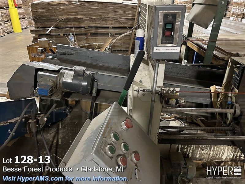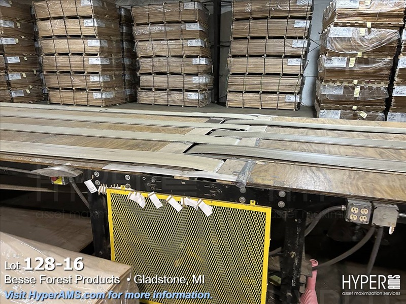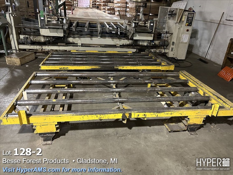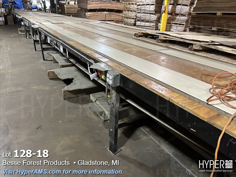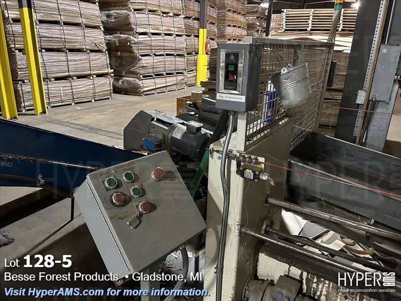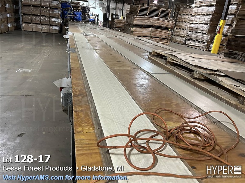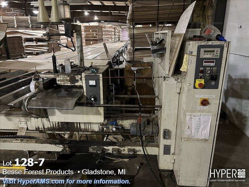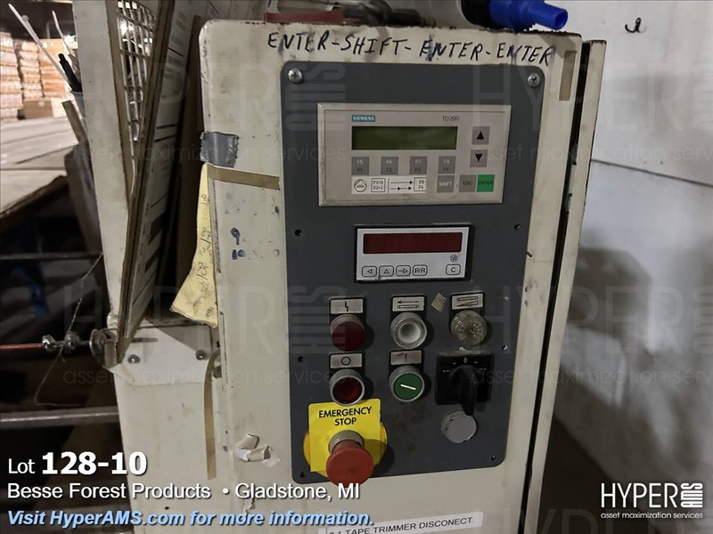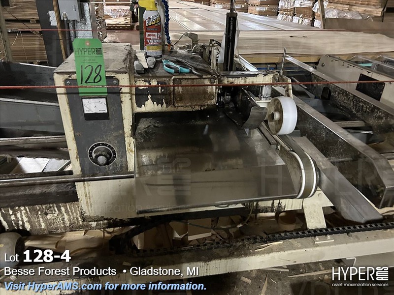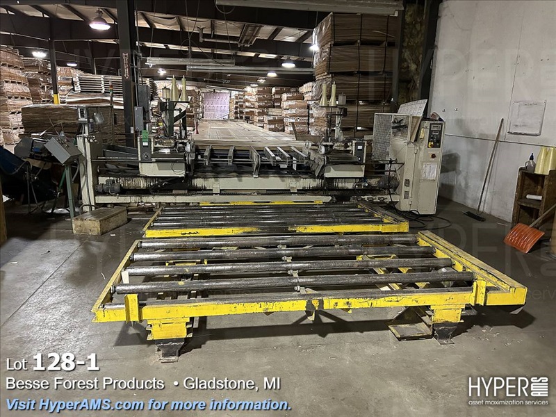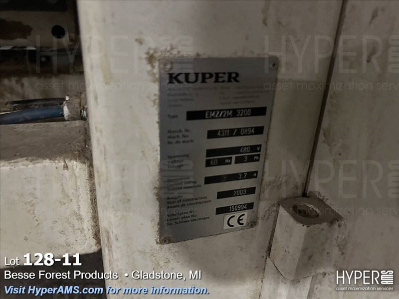 KUPER EMZ/2M 3200 DOUBLE END TRIMMER/SPLICER, 126", SIEMENS CONTROL, YEAR 2003, S/N#4311/0894, WITH BELT SCRAP CONVEYOR AND SCISSOR LIFT TABLE, AND GRADING TABLE APPX. 80'