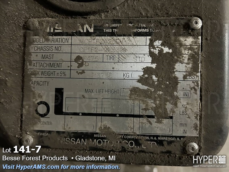 NISSAN FORKLIFT, LP, NISSAN 50, MODEL MCP1F2A251V, 187" LIFT, CHASIS #CP1F2-9P5399, SIDE SHIFT