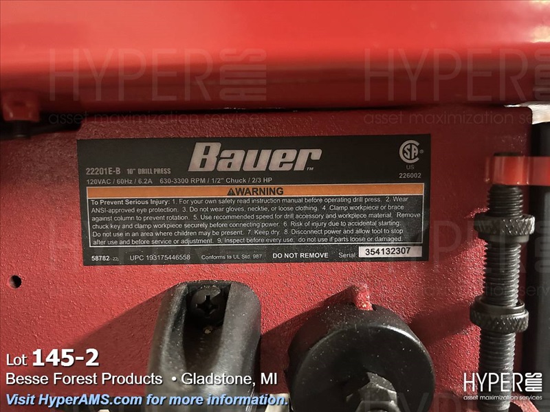 BAUER BENCH MODEL DRILL PRESS, 10", 1/2" CHUCK, 2/3 HP, 120 VOLT