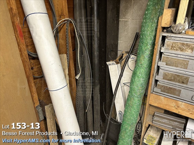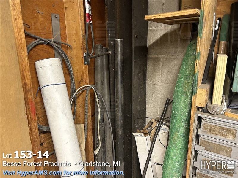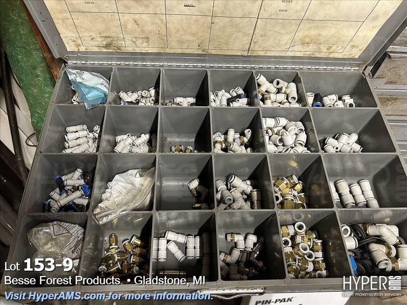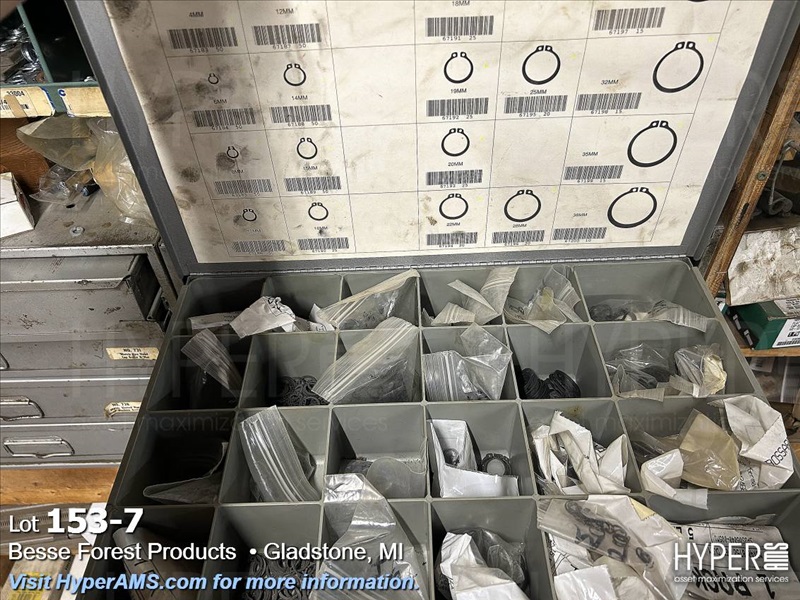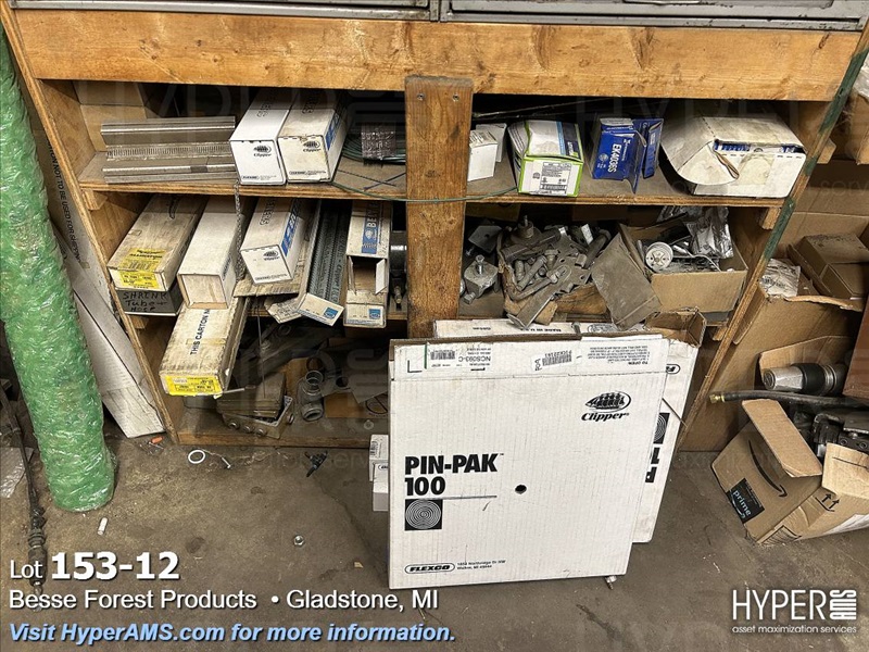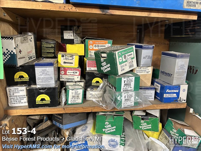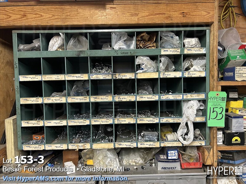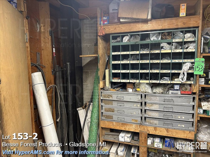 CONTENTS ON WOOD SHELVES-2-4 DRAWER FASTNER CABINETS, 40 HOLE PARTS BIN, ASSORTED FASTNERS IN BOXES, BELT CLIPS, METAL IN CORNER, ETC.