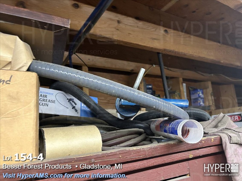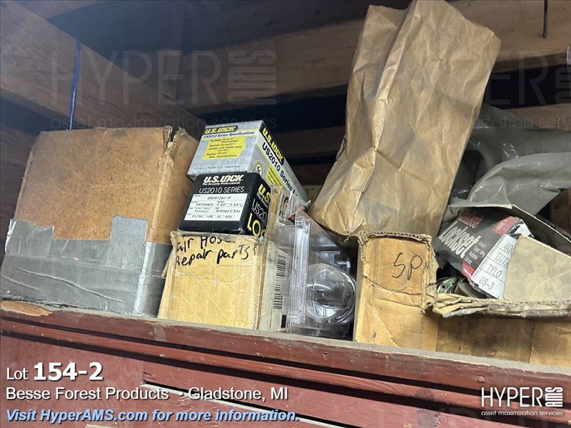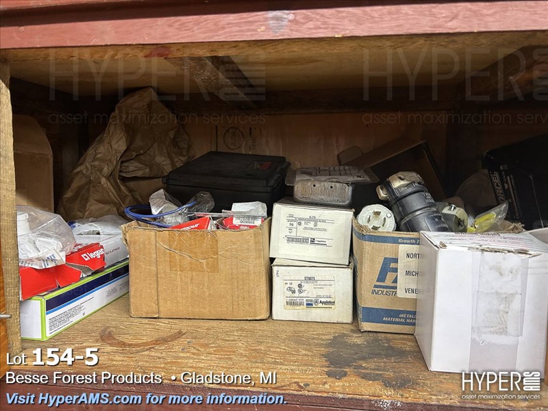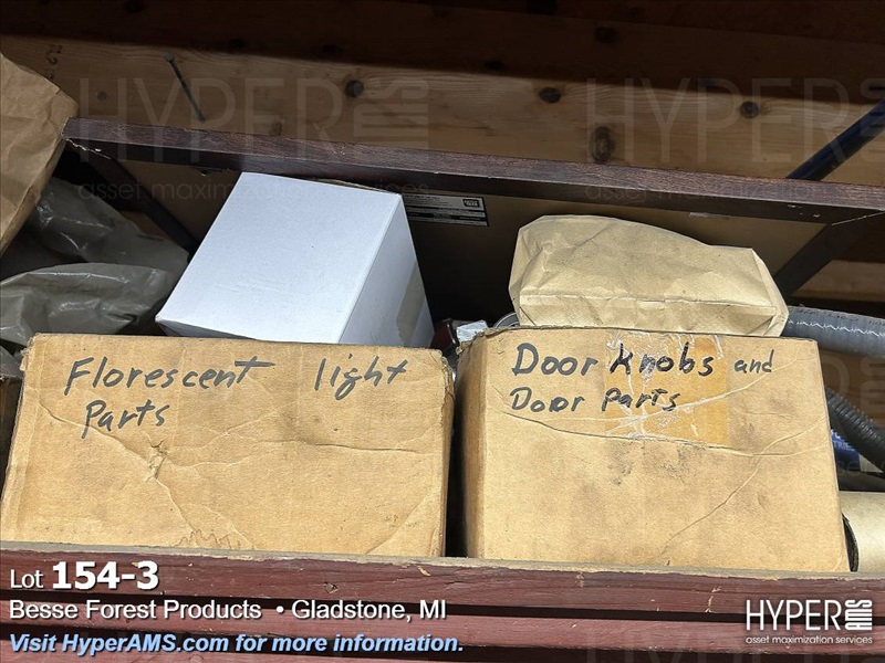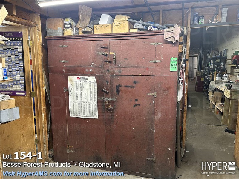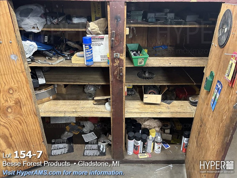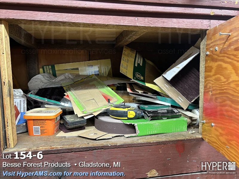 WOOD CABINET WITH CONTENTS-PLUGS, ABRASIVES, DOOR PARTS, CABLE, CHIESELS, ETC.
