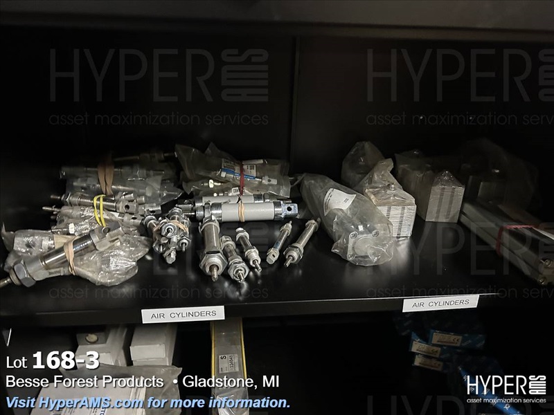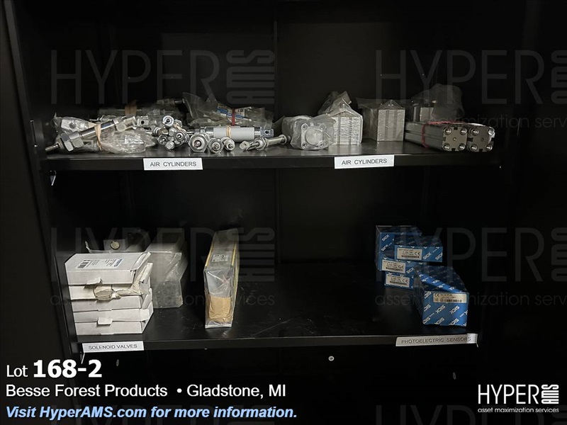 2 DOOR CABINET WITH MACHINE REPAIR PARTS-VALVES, AIR CYLINDERS
