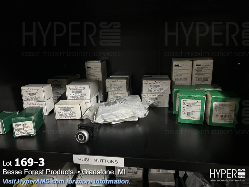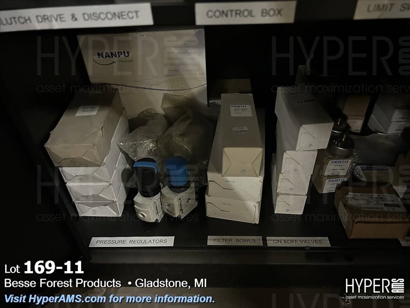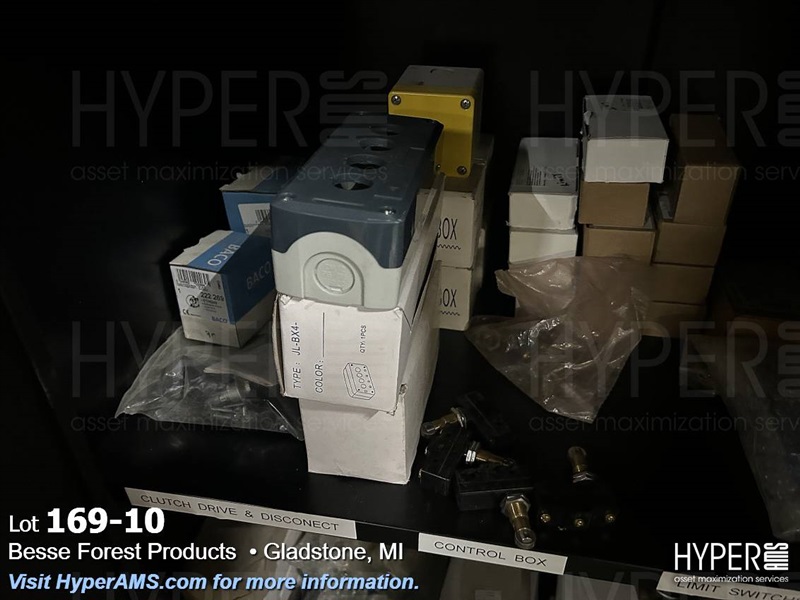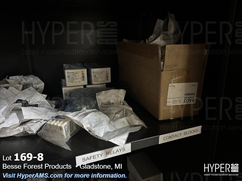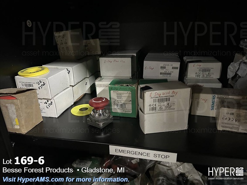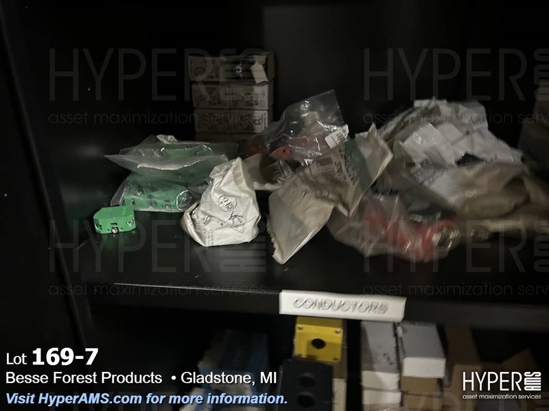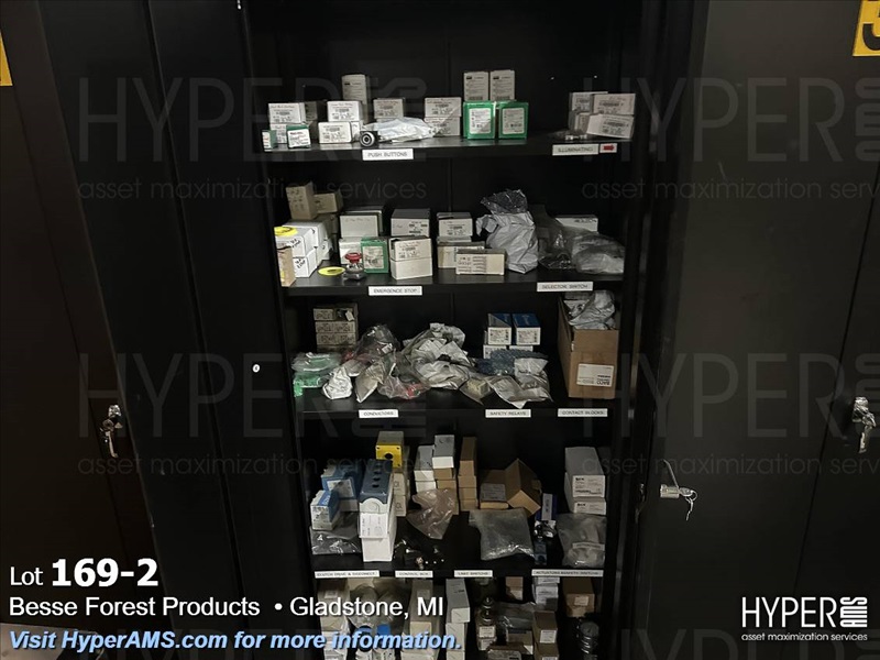 2 DOOR CABINET WITH MACHINE REPAIR PARTS-BUTTONS, EMERGENCY STOPS, CONNECTORS, SAFETY RELYS, LIMIT SWITCHESD