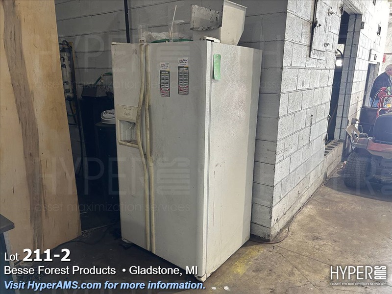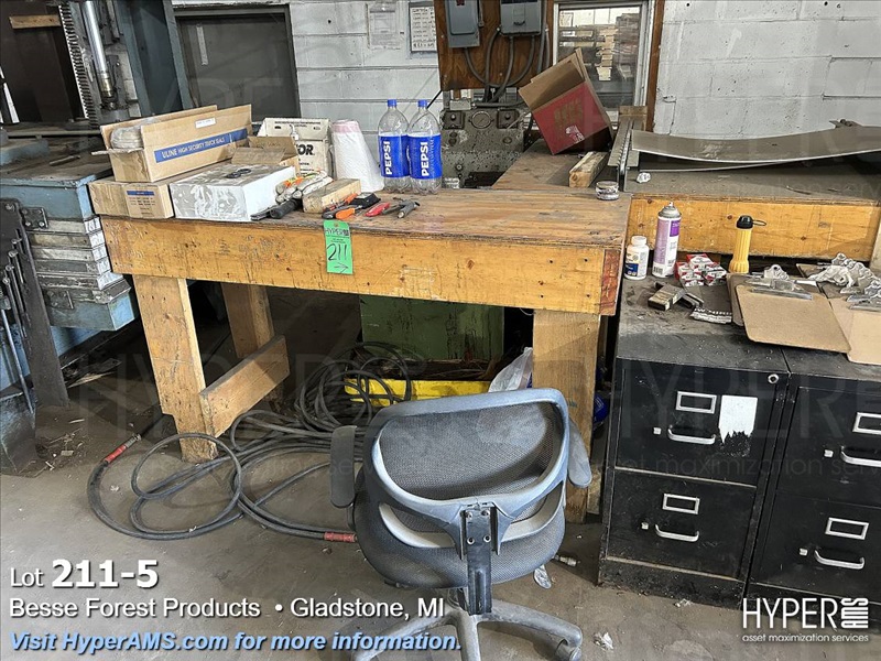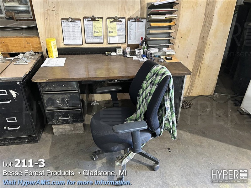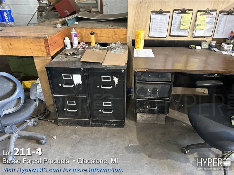 REFRIGERATOR, (2) 2 DRAWER FILES, DESK, (2) CHAIRS, WOOD BENCH