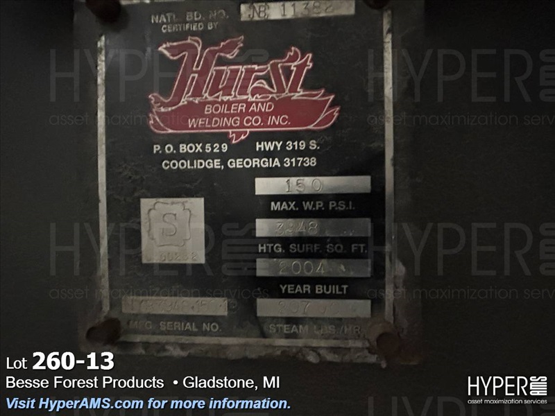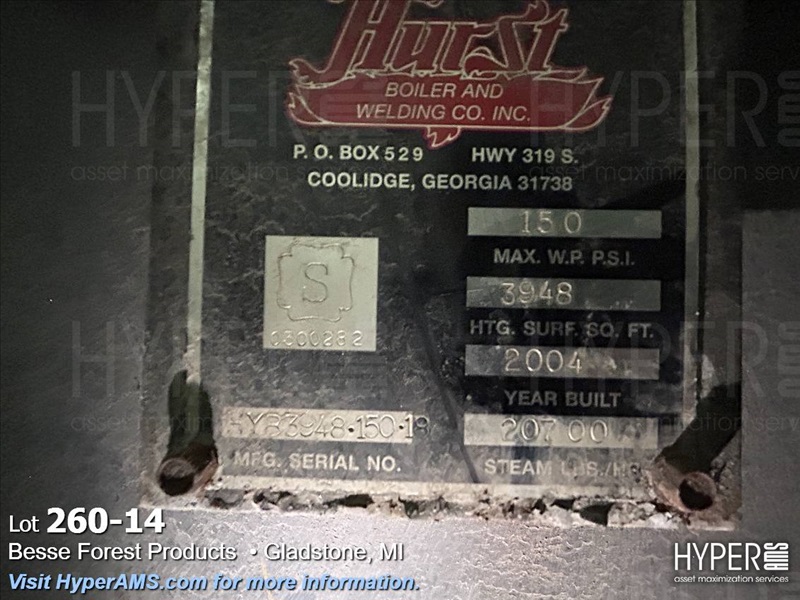 HURST BOILER, 20700# PER HOUR, 150 MAX-WP-PSI, 3948 HTG, SURFACE SQ FT, YEAR 2004