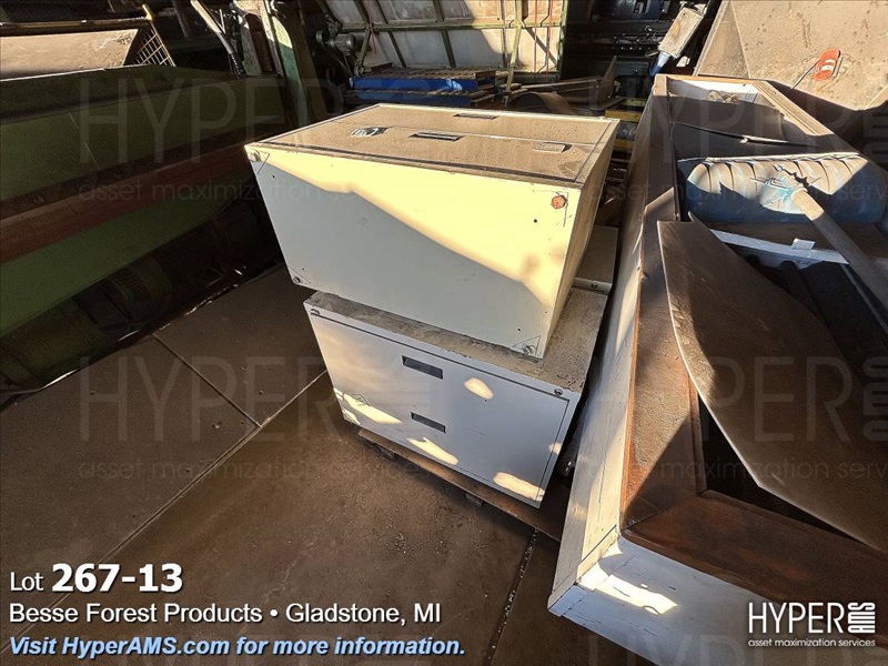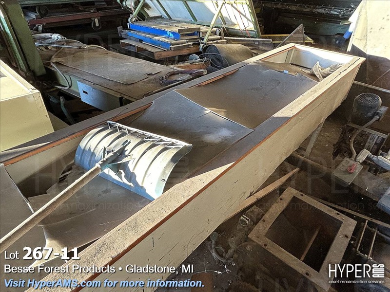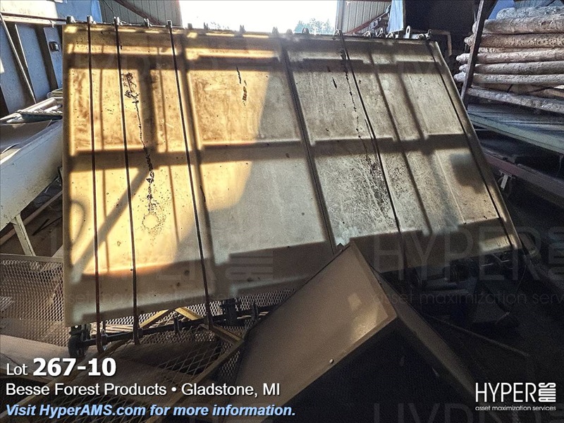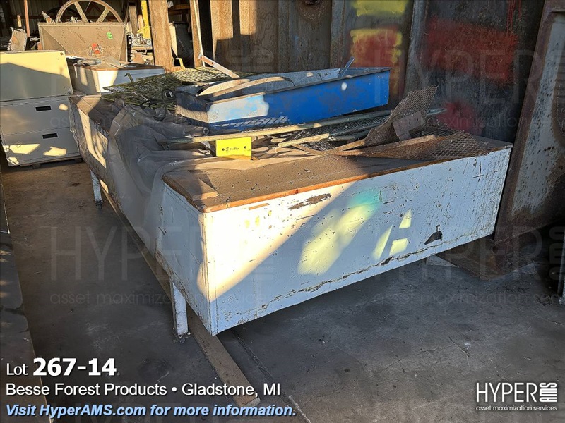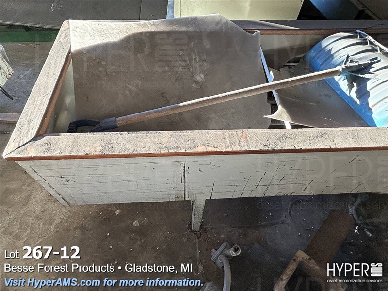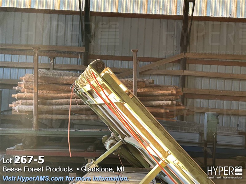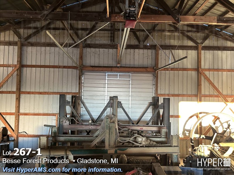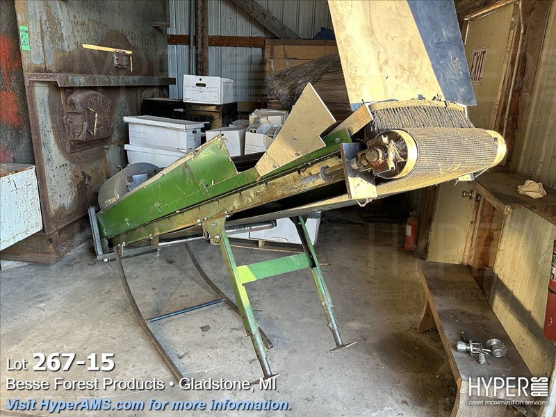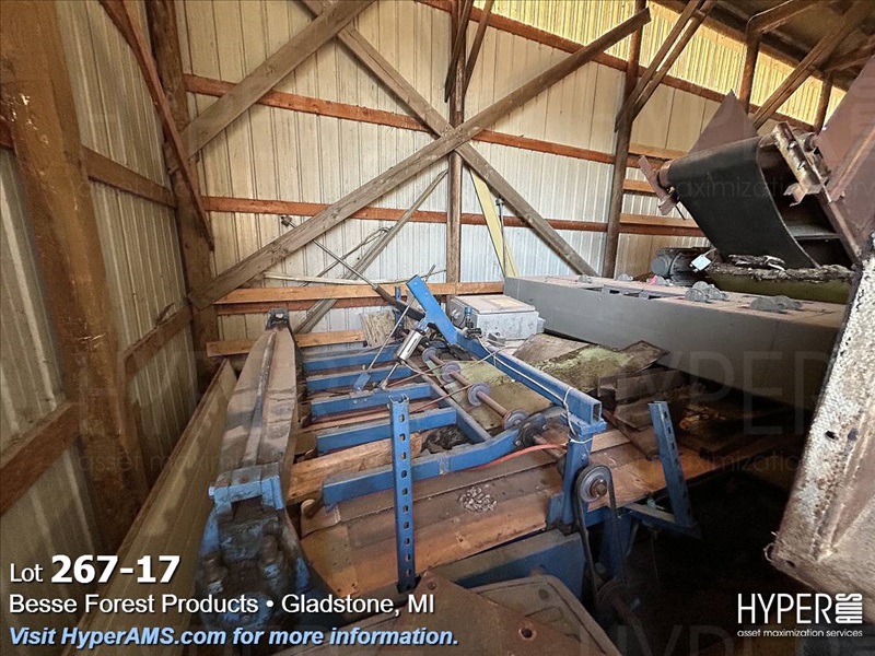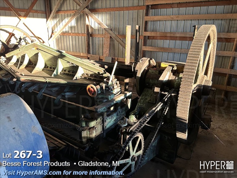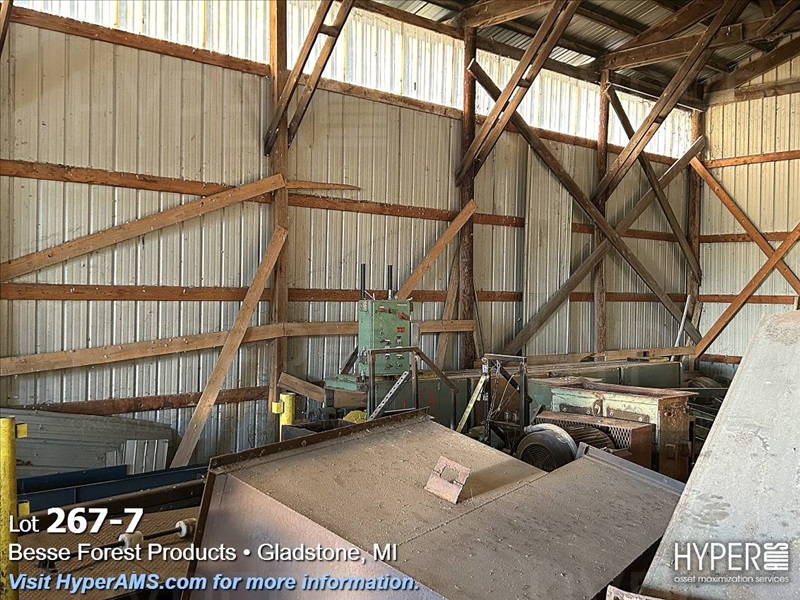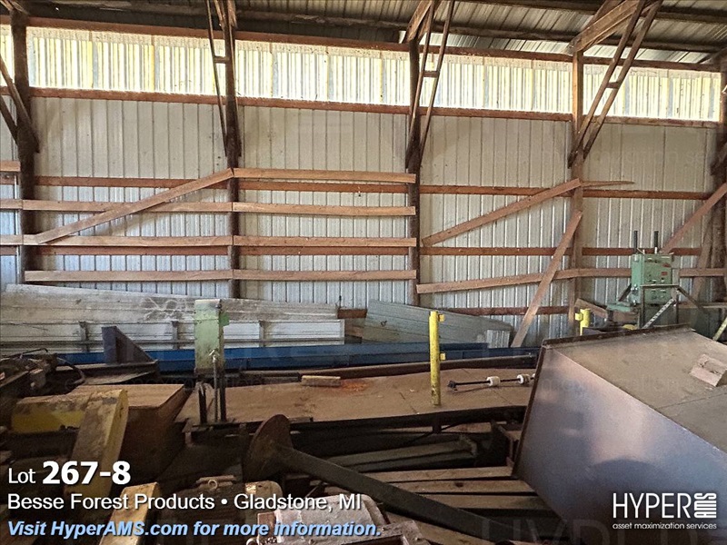 ASSORTED MACHINES AND PARTS IN BUILDING-VINEER COMPRESS PRESSE, 1/2 ROUND ALTHE, CONVEYOR, PALLET TRUCK, 24" CONVEYOR, (EXCLUDES LOT 260 BOILER PARTS AND LOTS 264 THRU 266)