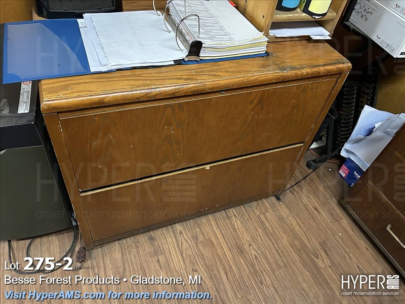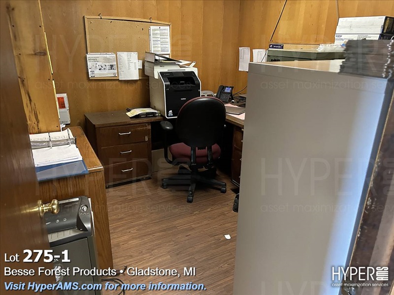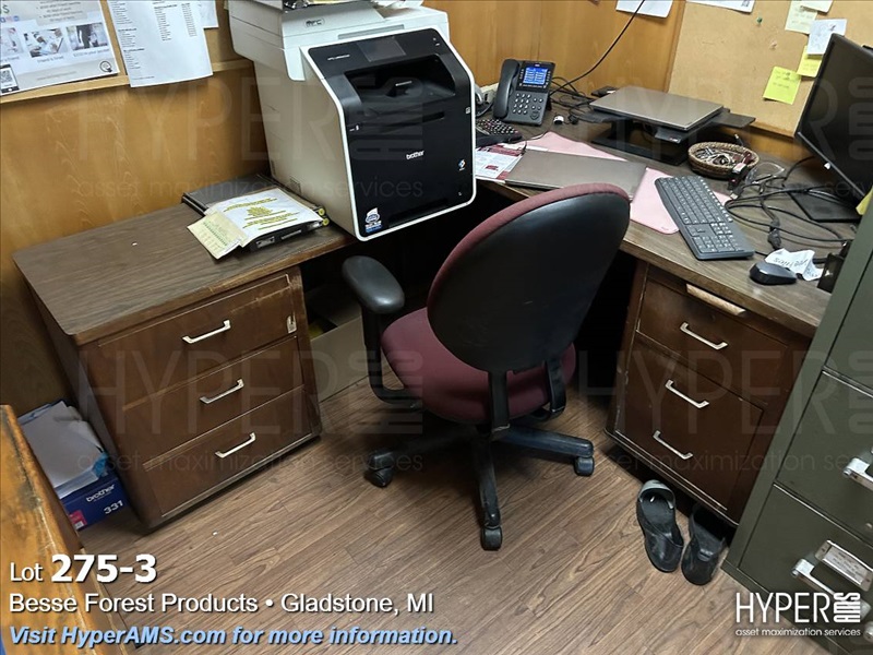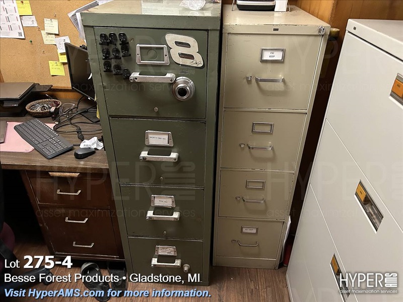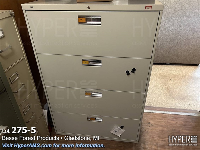 OFFICE SUITE CONSISTING OF DESK WITH LEFT-HAND RETURN, FOUR DRAWER SAFE FILING CABINET, FOUR DRAWER LATERAL FILING CABINET, FOUR DRAWER FILING CABINET, AND CHAIR