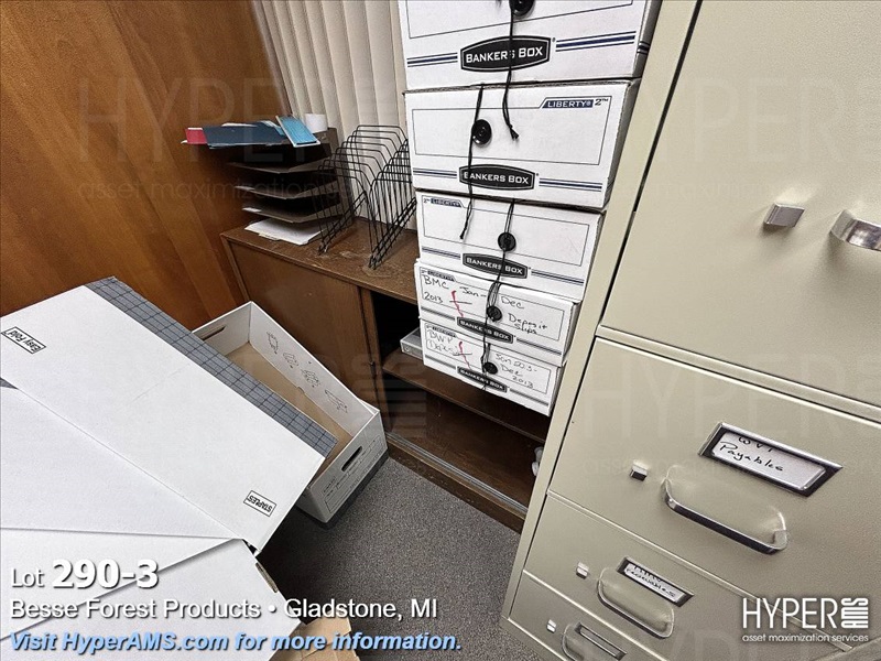 WOOD DESK WITH LEFT-HAND RETURN, WOOD CABINET, 2 FOUR DRAWER FILING CABINET