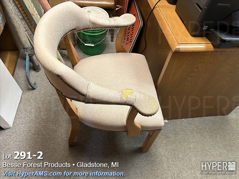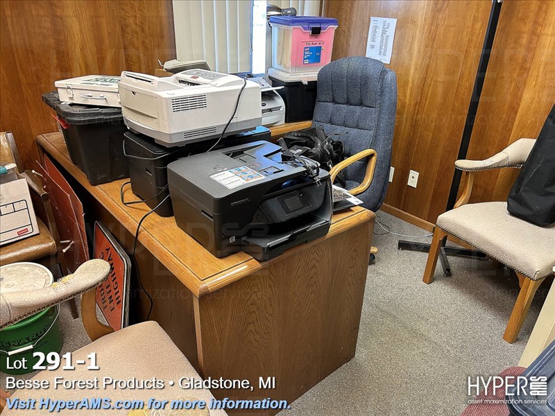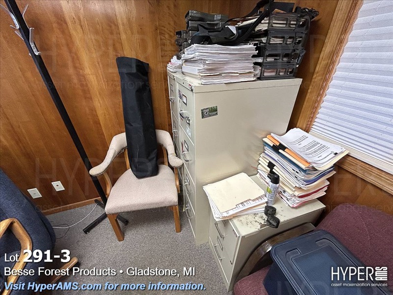 WOOD DESK WITH RIGHT-HAND RETURN, CHAIRS, SHELF, AND FOUR DRAWER FILING CABINET
