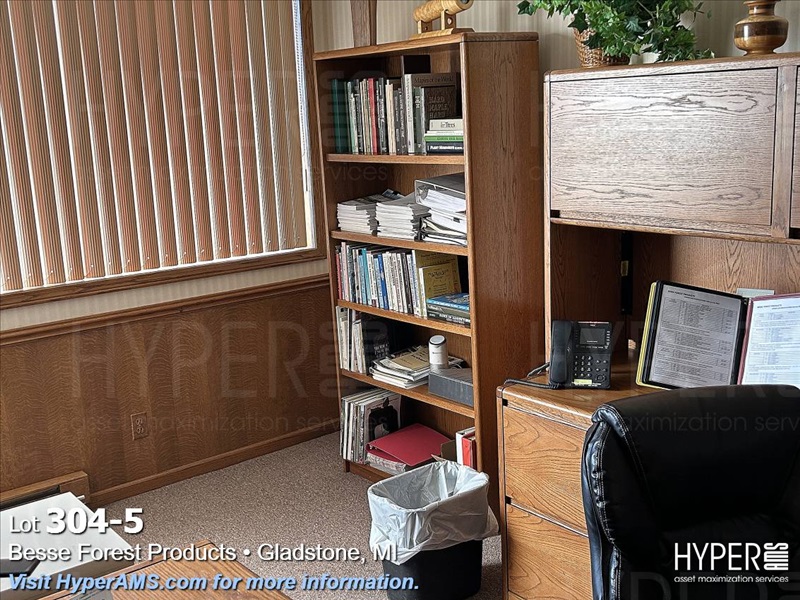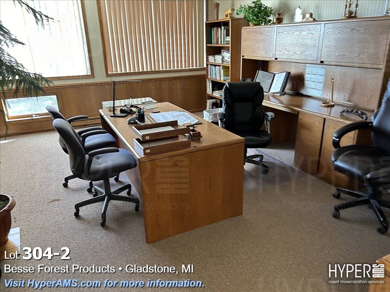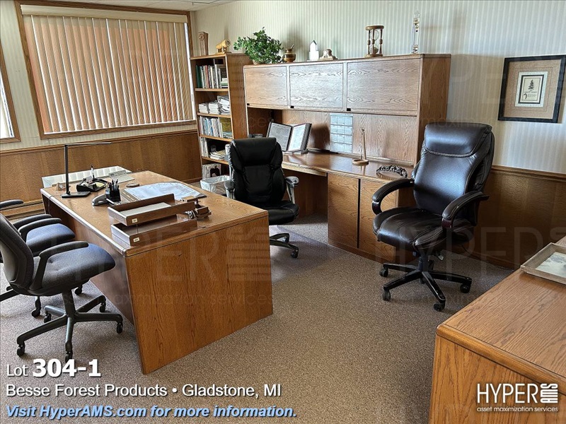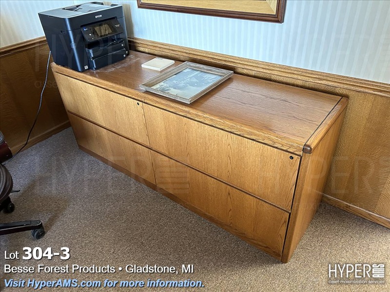 WOOD DESK 6' X 3' WOOD SHELF, CREDENZA 90", FOUR DRAWER LATERAL FILE CABINET, AND CHAIRS
