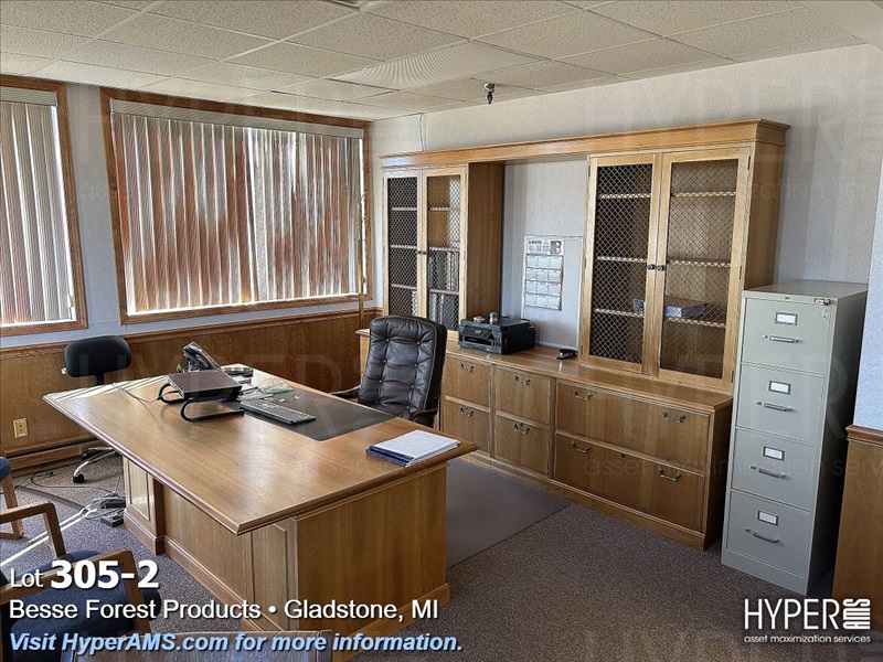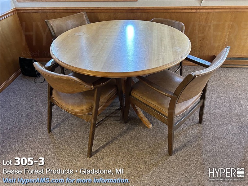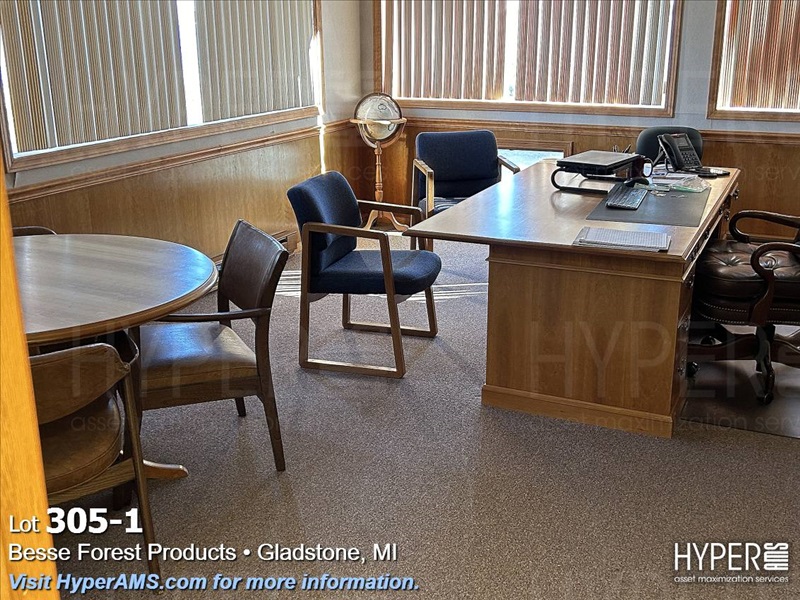 WOOD DESK 78" X 42", CREDENZA 112", ROUND WOOD TABLE 4', AND CHAIRS