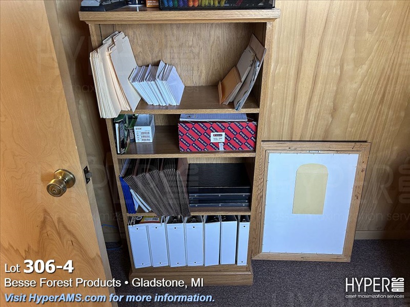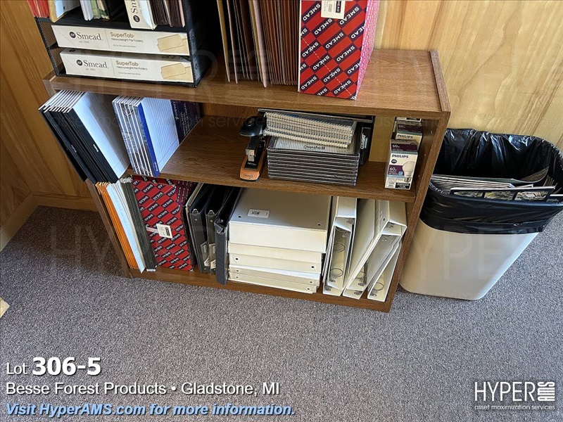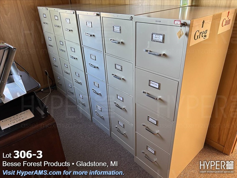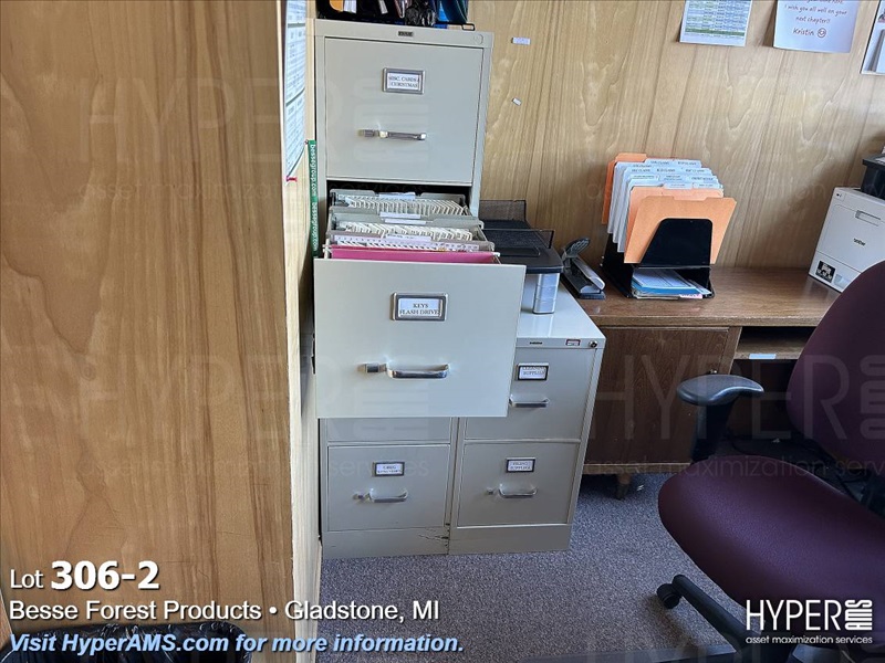 DESK WITH LEFT-HAND RETURN, SHELF, 7 FOUR DRAWER FILING CABINET, AND CHAIR