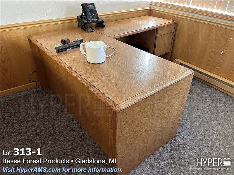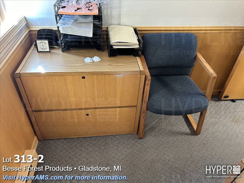 WOOD DESK WITH RIGHT-HAND RETURN, CHAIR, AND FILING CABINET