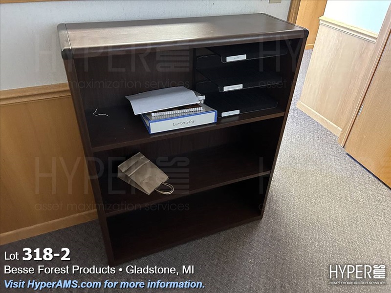 WOOD DES WITH LEFT-HAND RETURN, BOOKSHELF, AND CHAIR