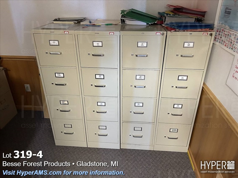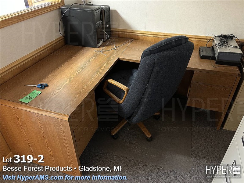 WOOD DESK WITH RIGHT-HAND RETURN, 4 FOUR DRAWER FILEING CABINET