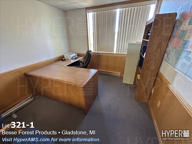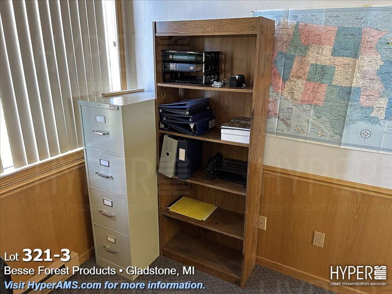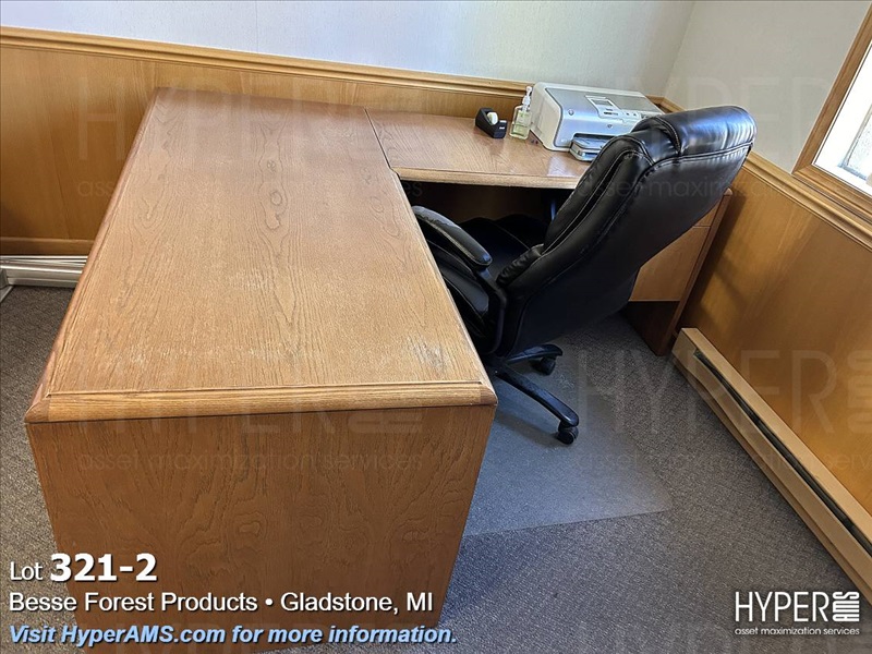 WOOD DESK WITH RIGHT-HAND RETURN, FILE CABINET, SHELF, AND CHAIRS