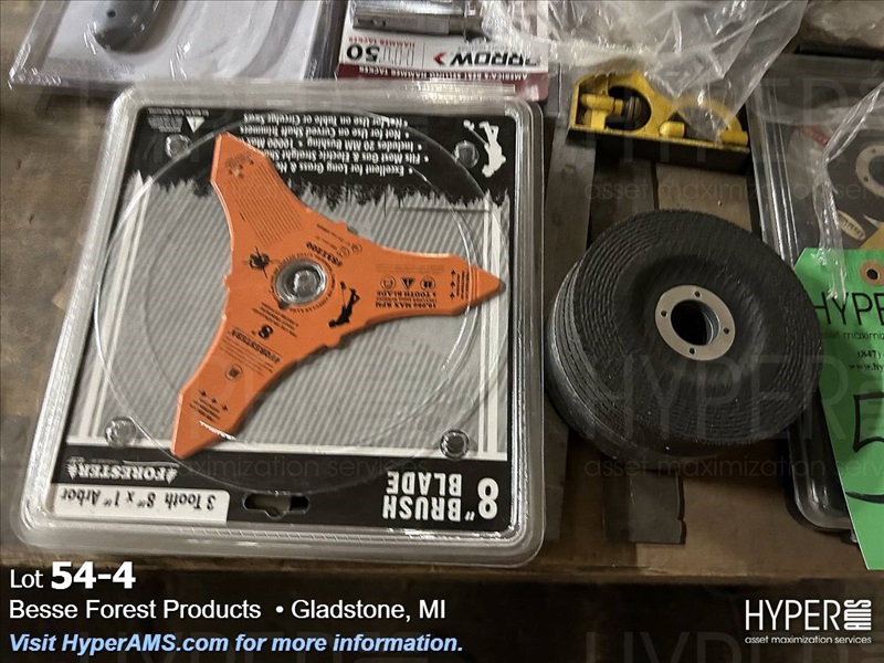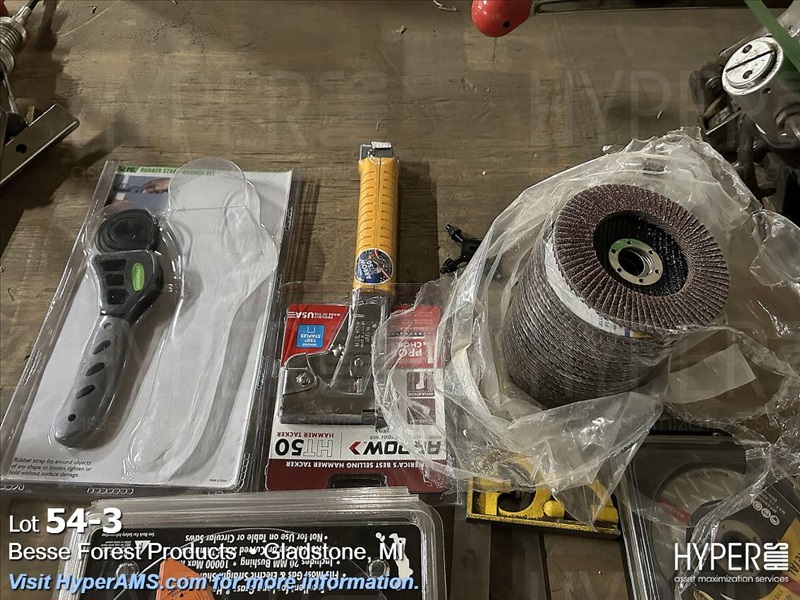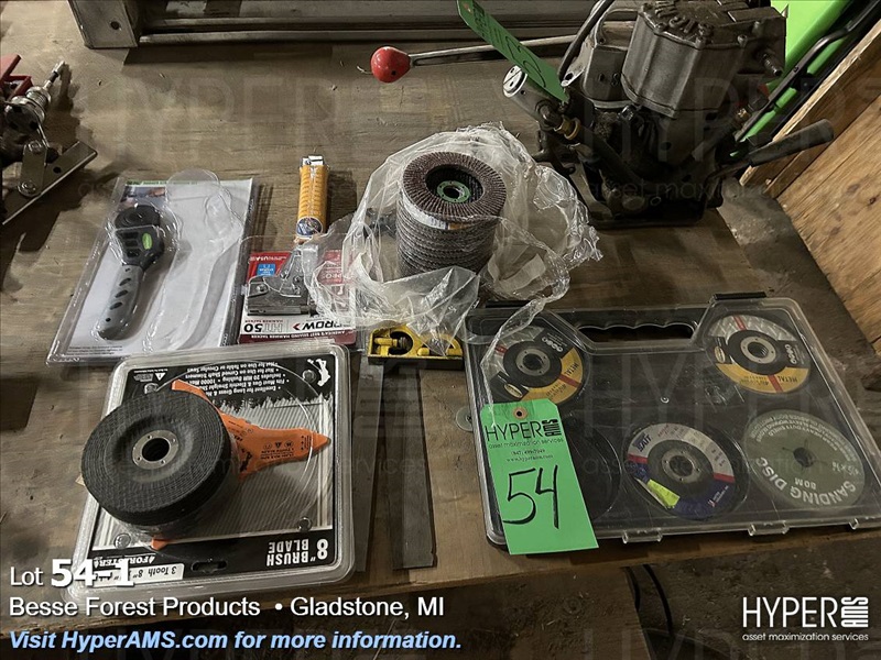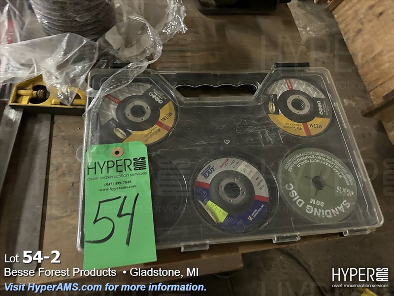 4 1/2" GRINDING WHEELS, 4 1/2" ALUMINUM FALP DISCS, HAMMER TACKER, STARP WRENCH, (7) 8" BRUSH BLADES