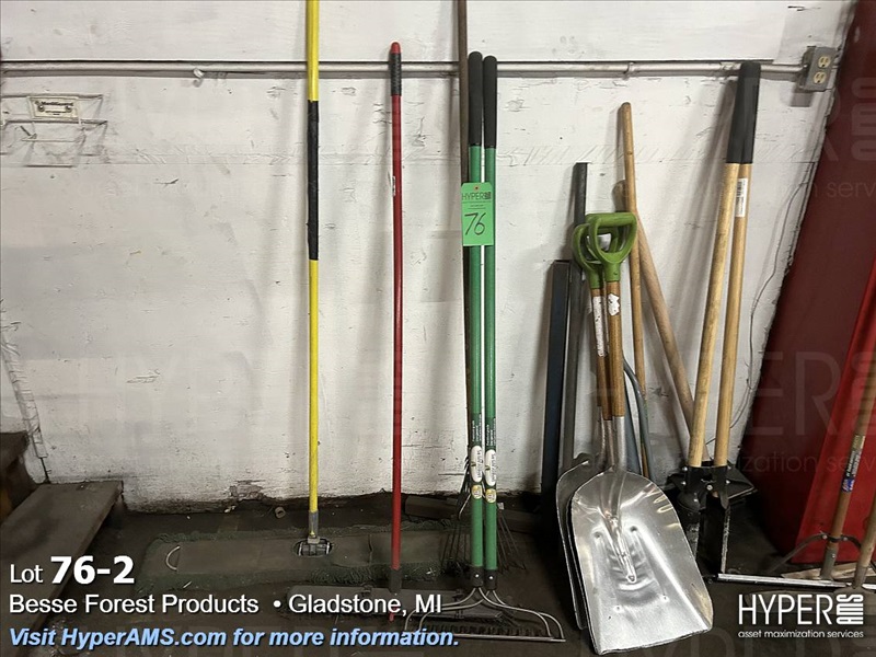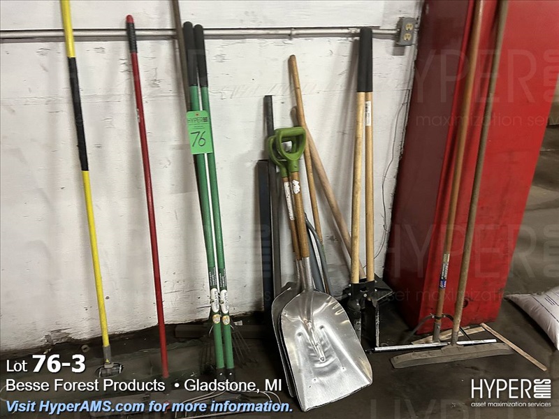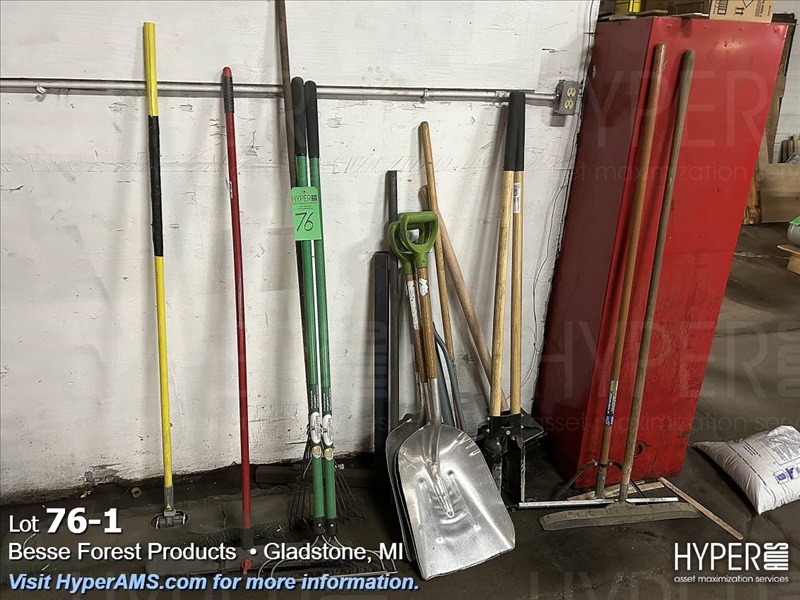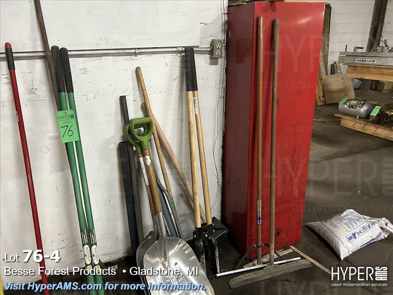 ASSORTED SHOVELS, BROOMS, TAMPER, RAKES, BROOMS, ETC.