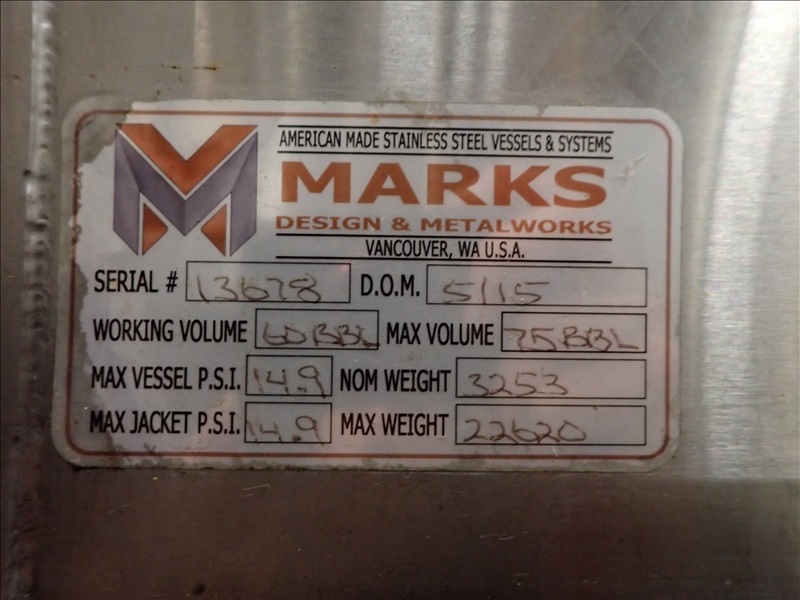 (5) 2015 MARKS 60 BARREL S/S JACKETED FERMENTATION TANKS, RANCO ETC'S, FRONT GATES, 75 BARREL MAX VOLUME, ADJUSTABLE HEIGHT LEGS, S/N'S:13678; 13782; 13783; 13679; N/A