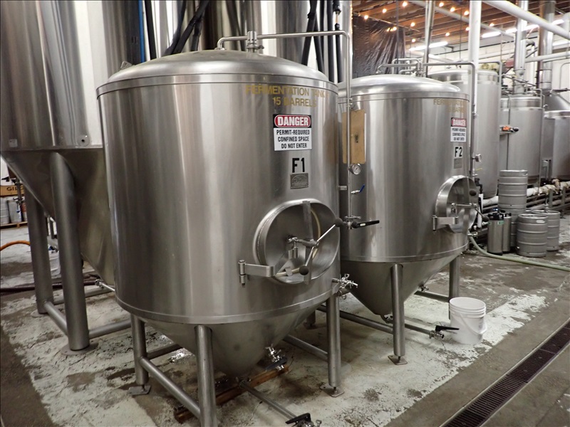 (2) THE PUB BREWING 15 BARREL S/S JACKETED FERMENTATION TANKS, RANCO ETC, FRONT GATE, ADJUSTABLE HEIGHT LEGS