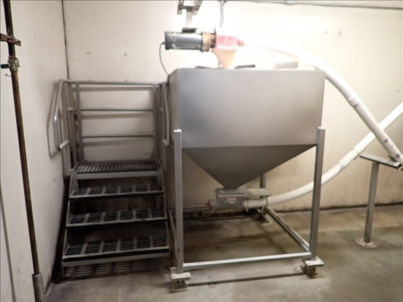 48"X48" GRIST TANK ON LOAD CELLS, CARDINAL DIGITAL READOUT, LEVEL SENSOR, CHORE-TIME, FLEX AUGER CONVEYOR, STAIRS