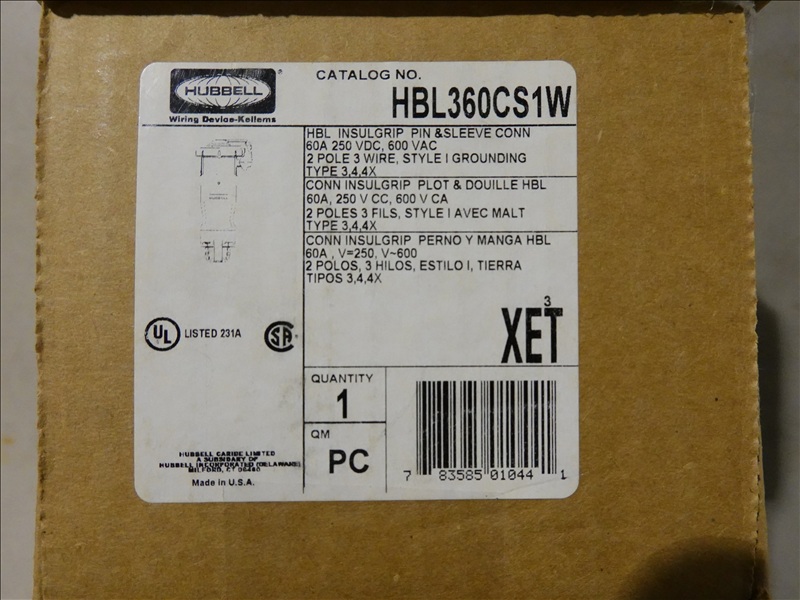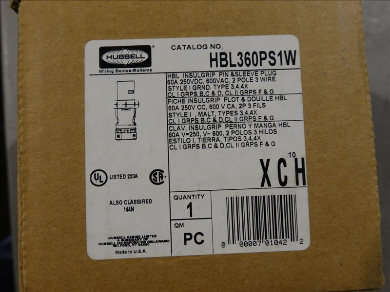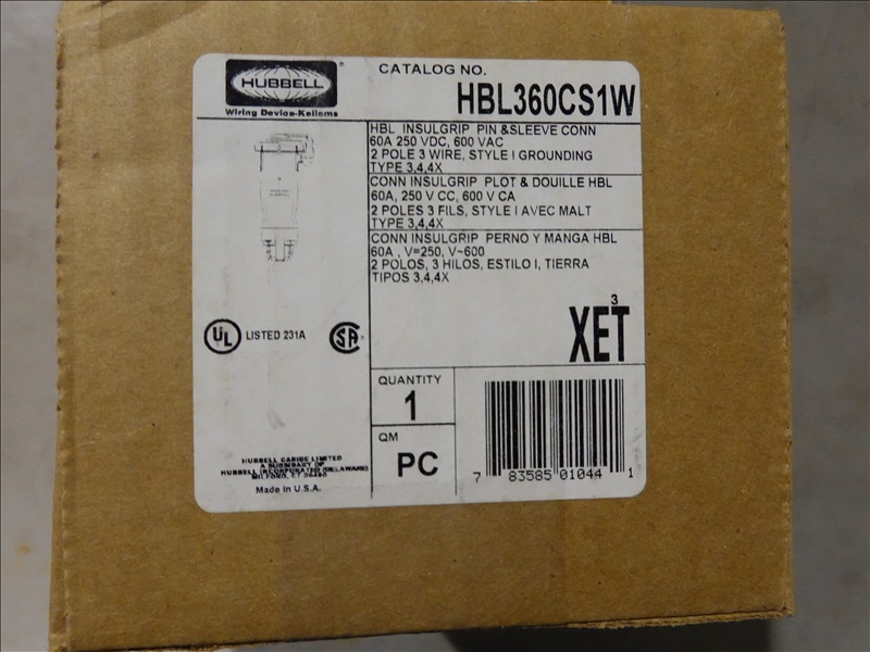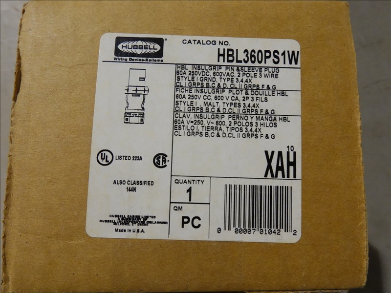 LOT, (5) HUBBELL HBL360CS1W PIN & SLEEVE CONNECTOR FEMALE, H/D INSULATED STANDARD WATER RIGHT CORD MOUNT, 600 VAC/250 VDC, 60A, 2 POLE, 3 WIRE