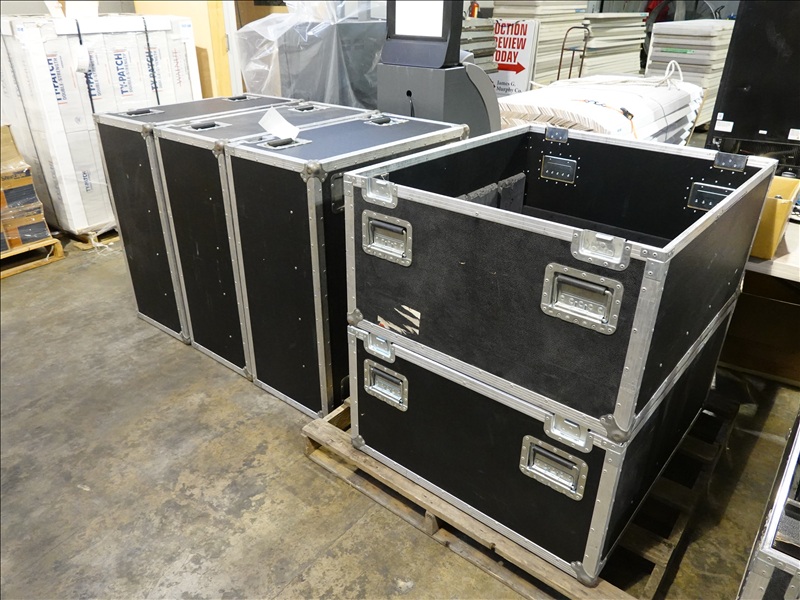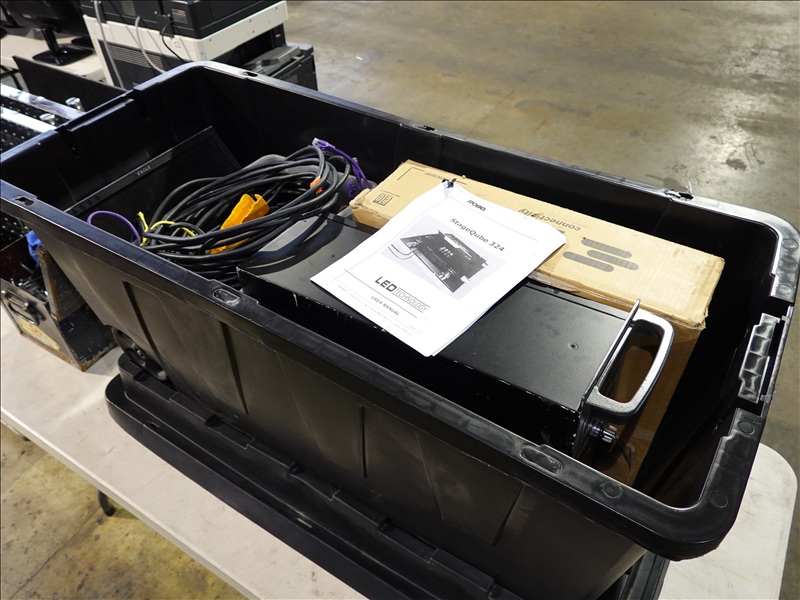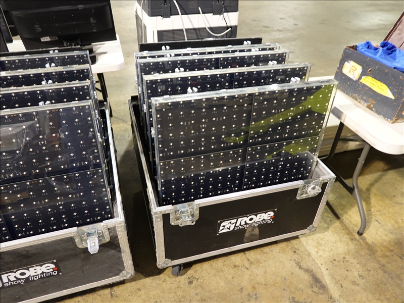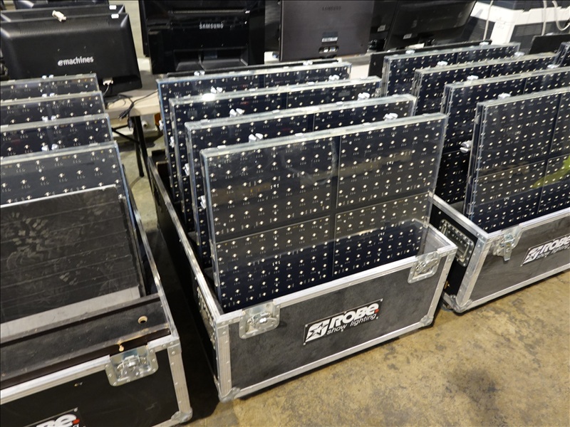 (20) ROBE STAGEQUBE 324 VIDEO PANELS (18 X 18 PX, 110 - 240V, 50/60HZ), ROBE STAGEQUBE CONTROL 4U RACK SERVER W/ (MONITOR, PERIPHERALS, AND CORDS), (6) 2'X2' STEEL BASE PLATES, (5) ROBE STACKABLE ROAD CASES W/CASTERS, (20+) CAT5 ETHERNET PATCH CABLES, (20) 10/3 POWERCON 5' JUMPER A/B CABLES, (3) 10/3 POWERCON 5' IEC CABLES, (80+) LOCKING BRACKETS W/ PINS AND RETAINER CLIPS W/CASE + MISC TOOLS, 35FT VGA CABLE, ANTI GLARE MESH TARP 10'X12'
