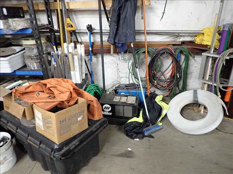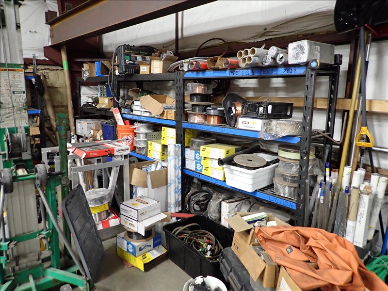 WELDING WIRE, ALUMINUM RACK, WIRE FEEDER, CASTERS, OXY/ACETYLENE SET, JOBOX, SHELVING & MISC. SHOP SUPPLIES