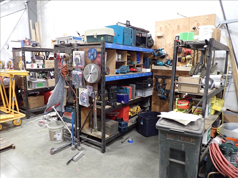 SHELVING UNITS W/POWER TOOLS, CORDLESS TOOLS, INSTALL TOOLS & MISC. SHOP SUPPLIES