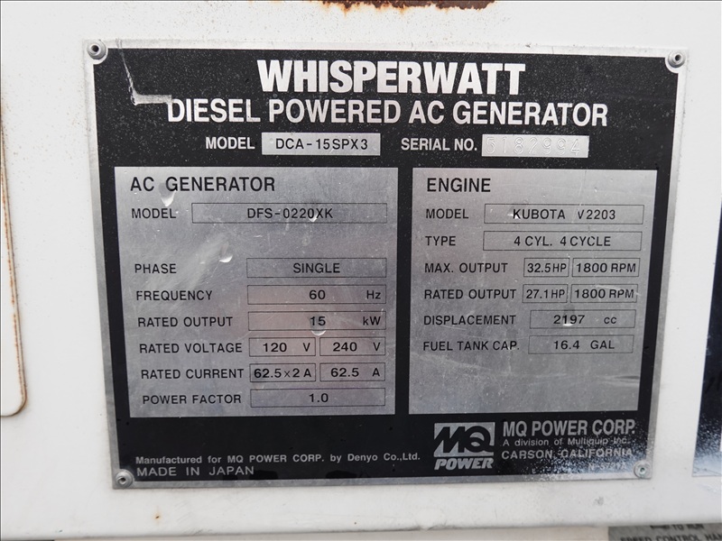 15 KW AC GENERATOR W/KUBOTA V2203 4 CYL DIESEL ENGINE, HOUR METER READS: 4,970