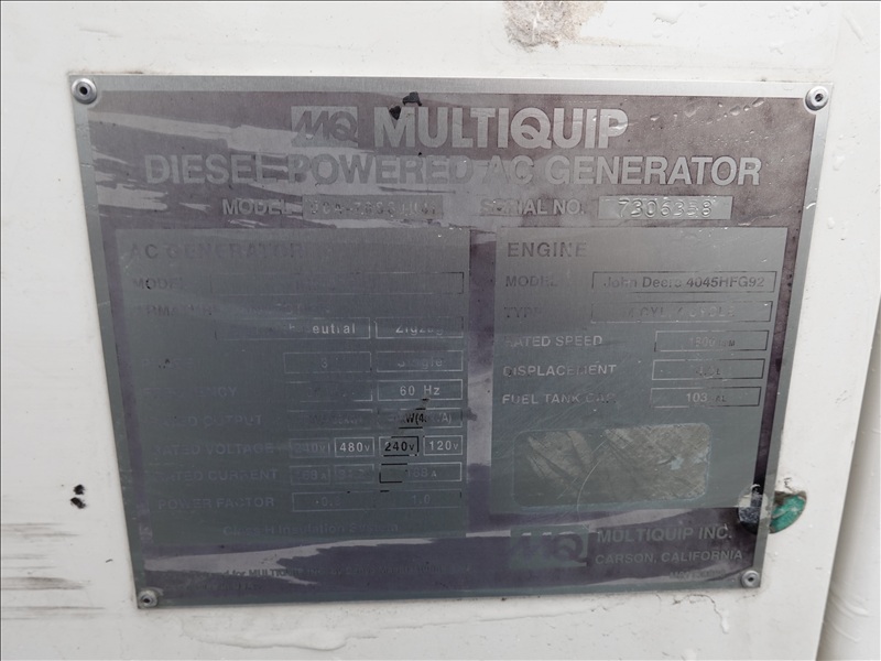 56 KW AC GENERATOR W/JOHN DEERE 4045HFG92 4 CYL DIESEL ENGINE, HOUR METER READS: 2,250