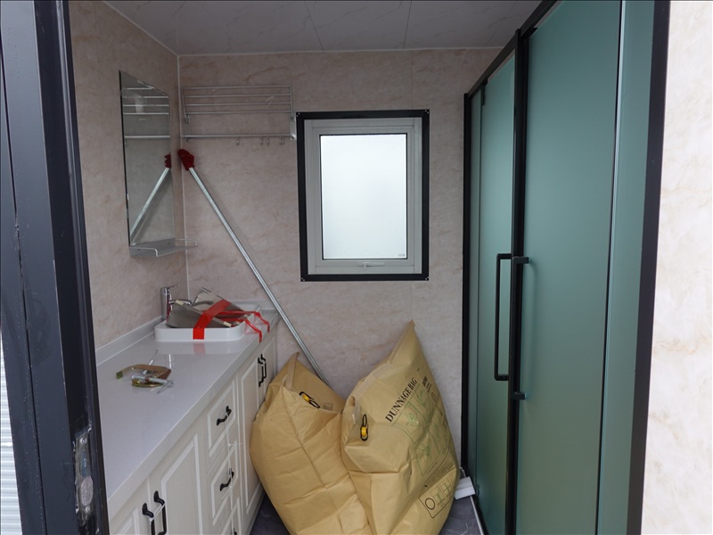 9' X 7' X 8' PORTABLE WASHROOM W/TOILET, SINK, SHOWER, LIGHTS, FUME EXTRACTOR & FORK POCKETS, 110V (UNUSED, MEASUREMENTS ARE APPROX)