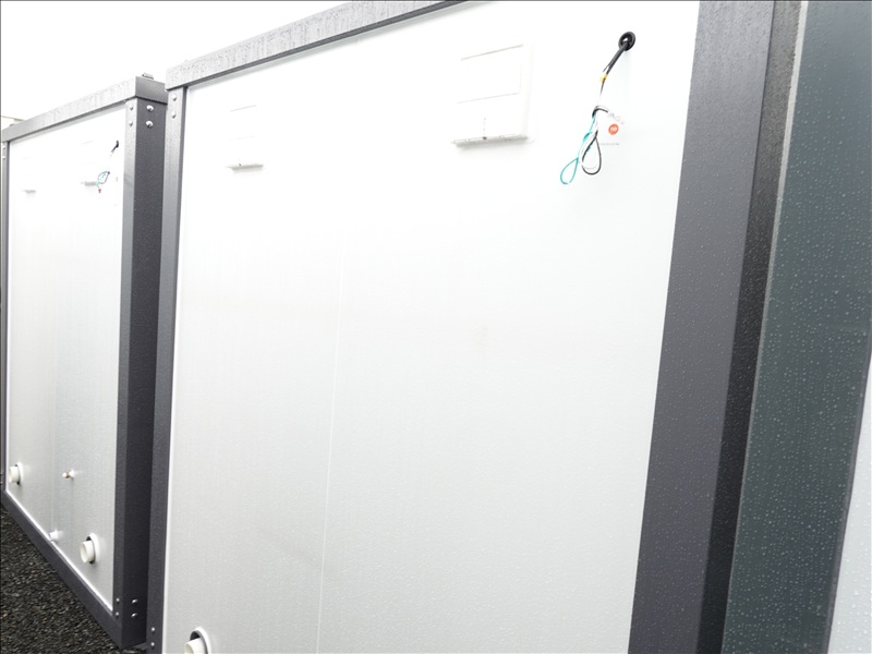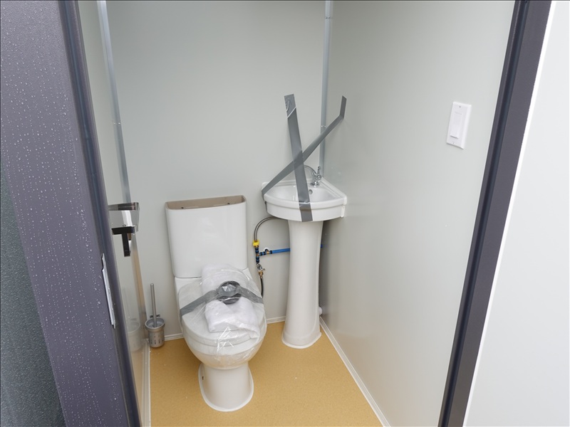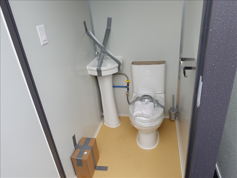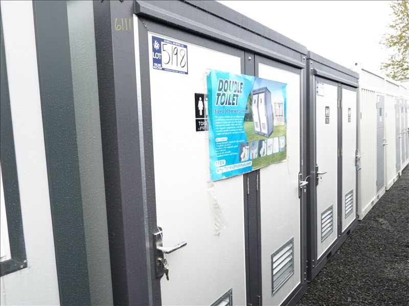 6.5' X 4' X 7.5' 2-STALL PORTABLE RESTROOM W/TOILETS, SINKS, LIGHTS, FUME EXTRACTORS & FORK POCKETS (UNUSED, MEASUREMENTS ARE APPROX)