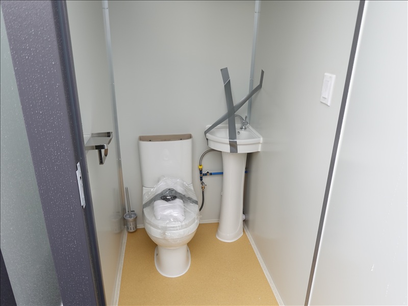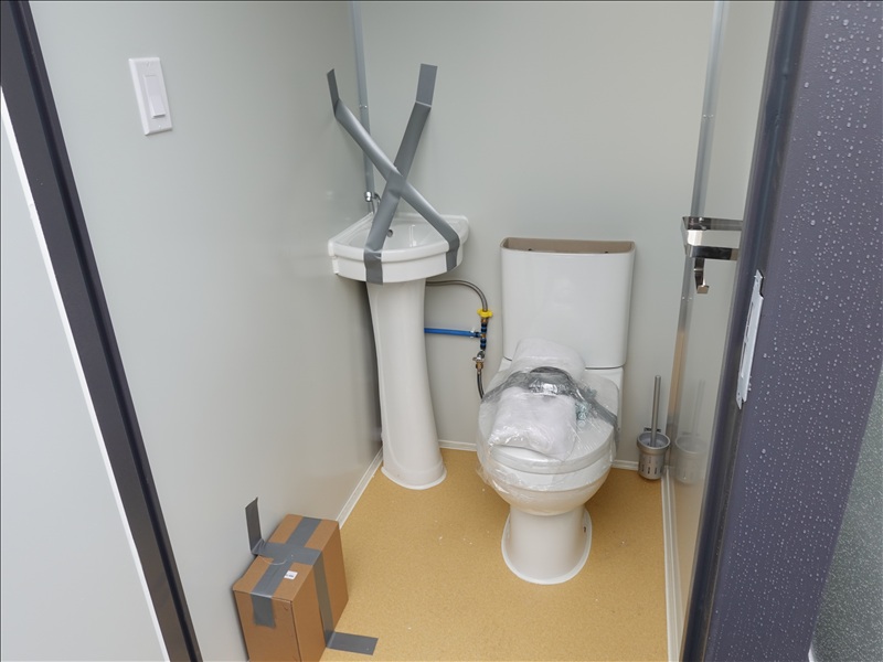 6.5' X 4' X 7.5' 2-STALL PORTABLE RESTROOM W/TOILETS, SINKS, LIGHTS, FUME EXTRACTORS & FORK POCKETS (UNUSED, MEASUREMENTS ARE APPROX)