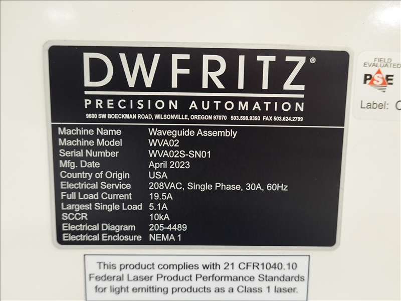 WAVEGUIDE ASSEMBLY CNC LASER CUTTER, 208 VAC, SINGLE PHASE, 30A, 60 HZ, 19.5A FULL LOAD CURRENT
