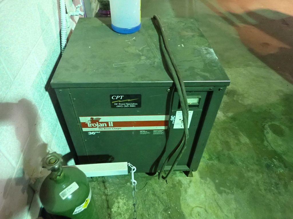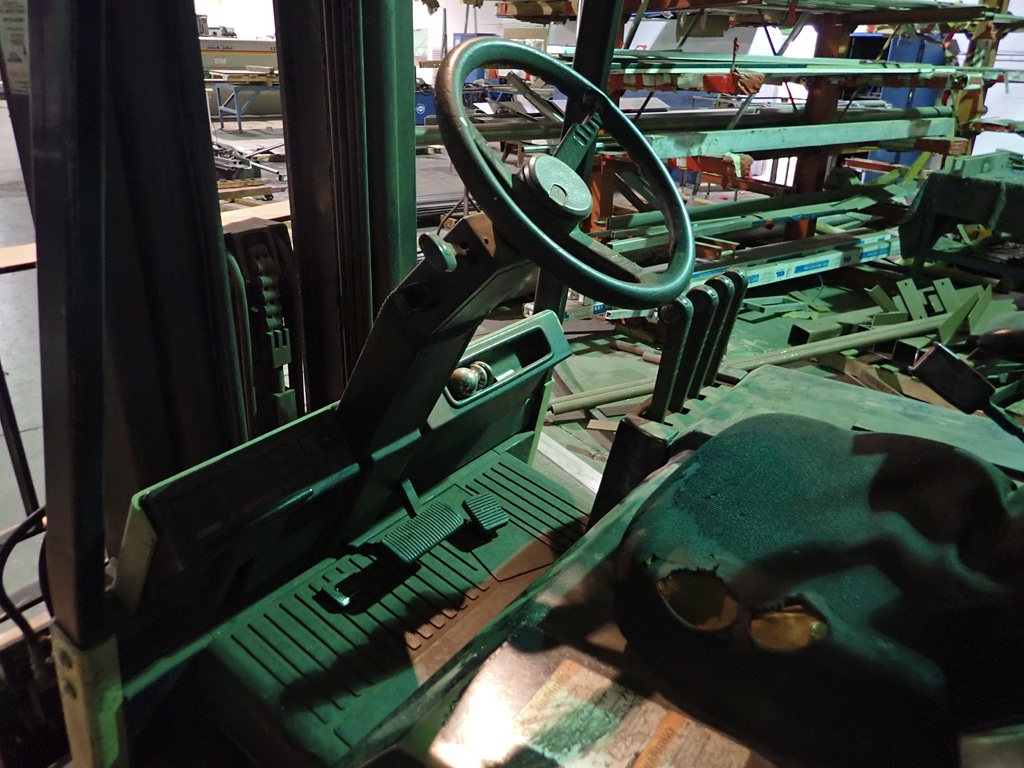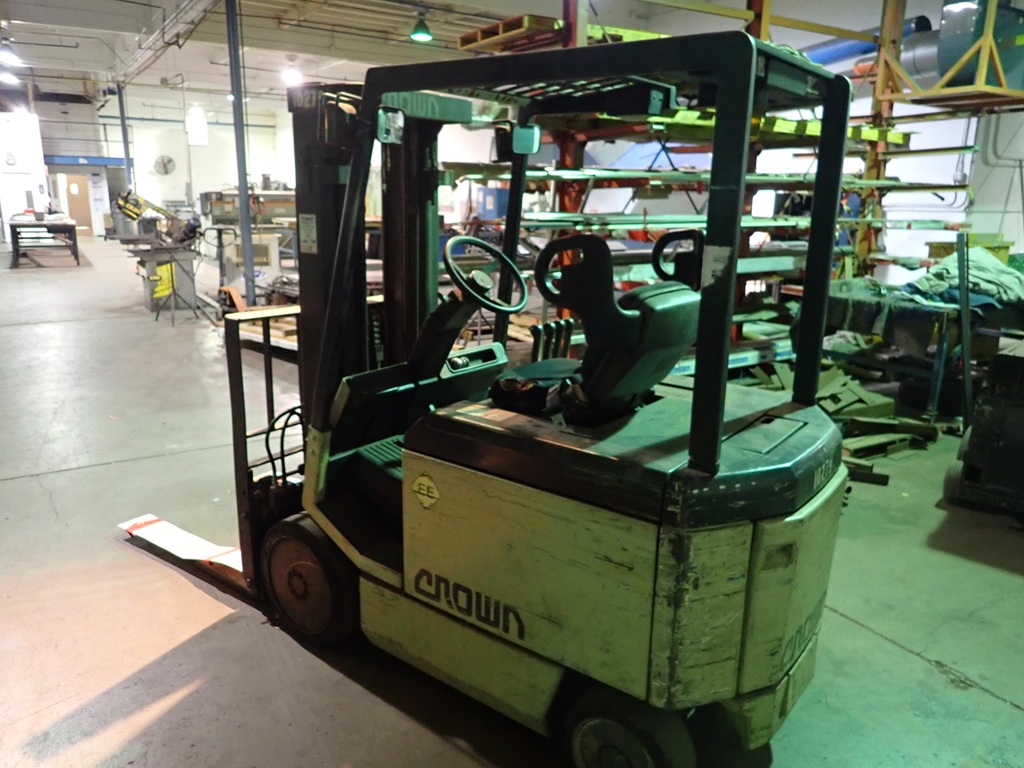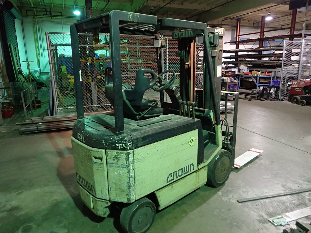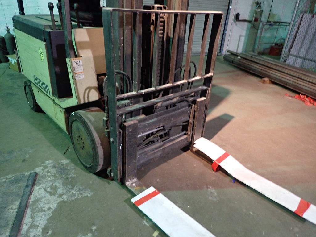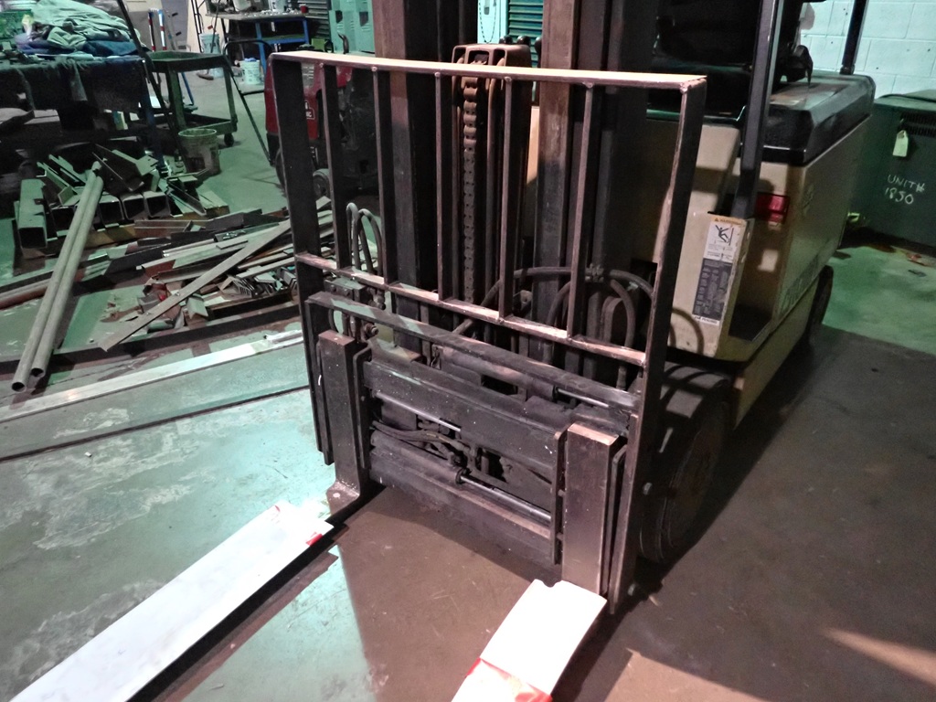 4,600 LB CAP. SOLID TIRED ELECTRIC FORKLIFT, 188" 3-STAGE MAST, SIDE SHIFT, FORK POSITIONERS, TROJAN II CHARGER